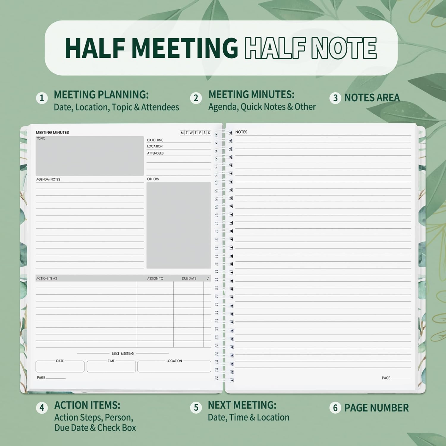 - Half Meeting Half Note: 1.MEETING PLANNING: Date, Location, Topic & Attendees 2.MEETING MINUTES: Agenda, Quick Notes & Other 3.NOTES AREA: Lined Page 4.ACTION ITEMS: Action Steps, Person, Due Date & Check Box 5.NEXT MEETING: Date, Time & Location 6.INDEX PAGE: Date, Title, Page Number, which will help create more effective meetings and good results.