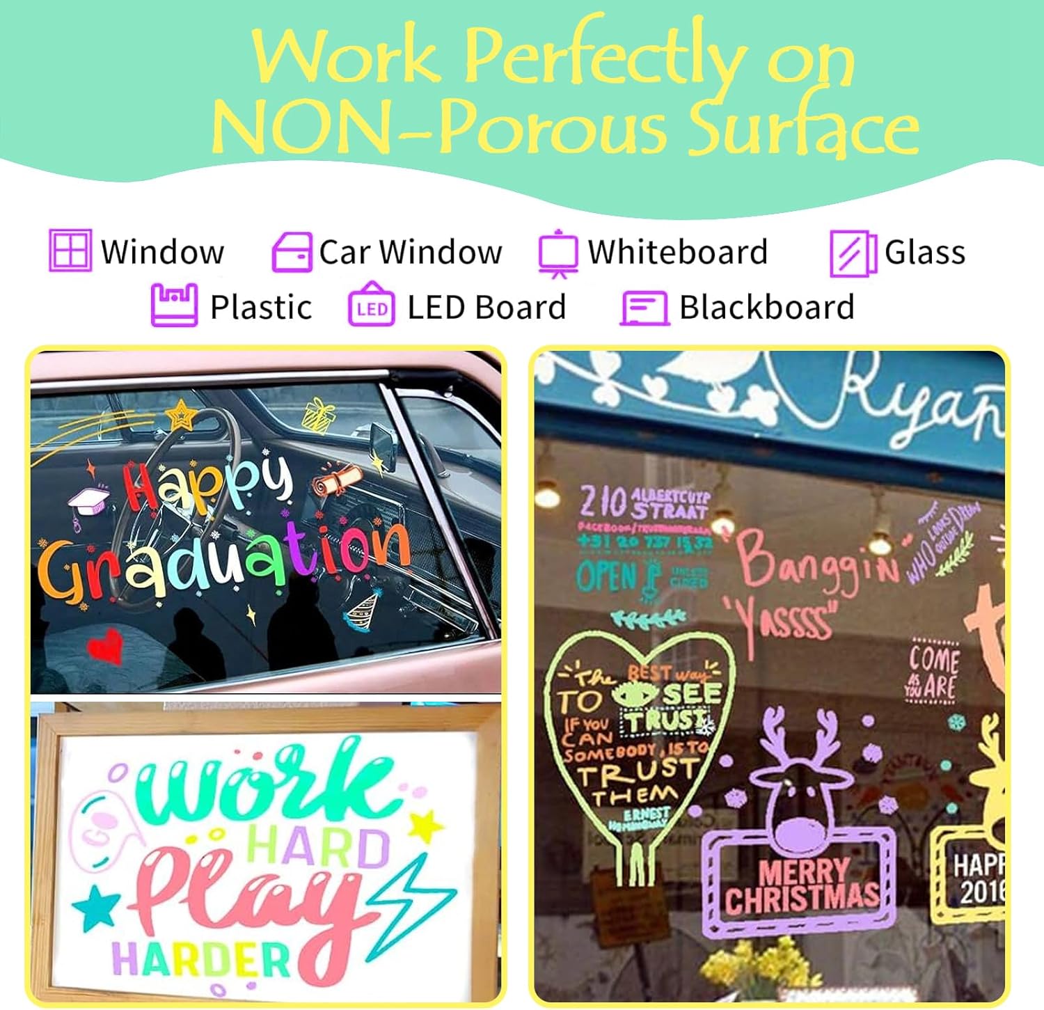 - Versatility Across Surfaces: Make your writing or drawing stand out with Chalk Markers. These brilliant chalkboard markers mark brightly on black boards, light boards, white boards, windows, glass, and more. these jumbo chalk markers prove their versatility on any non-porous surface. Depend on these markers for eye-catching displays or writing in the classroom, your business, or home.Ideal for car decoration, whiteboards, chalkboards, bistro boards, Christmas banners, posters, and various DIY arts and crafts.