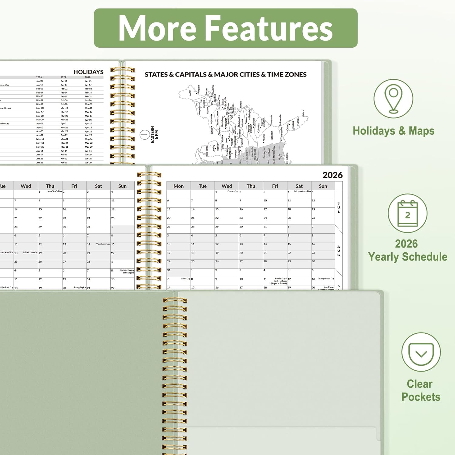- Additional Features - The weekly planner includes 2026-2028 calendars, year schedule for full year 2026, holiday lists, contact pages, notes pages, important dates, and US time zone map. Rainbow monthly tabs simplify navigation and add a stylish, playful element to the planner's aesthetic.
