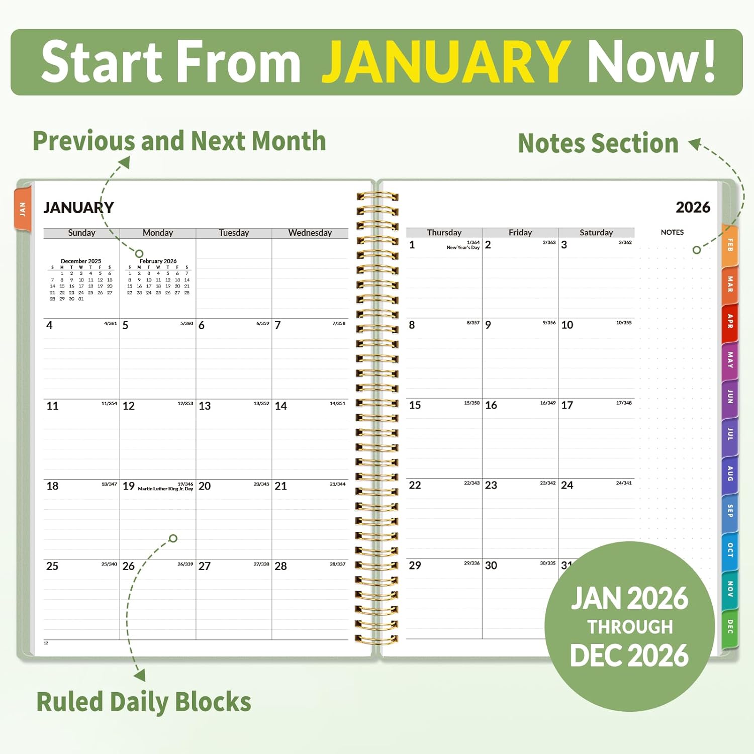 - Monthly View - Each date box provides ample writing space and includes the previous and next month's reference, ruled daily blocks with popular holidays, and Julian Dates for easy long-term project and appointment scheduling.
