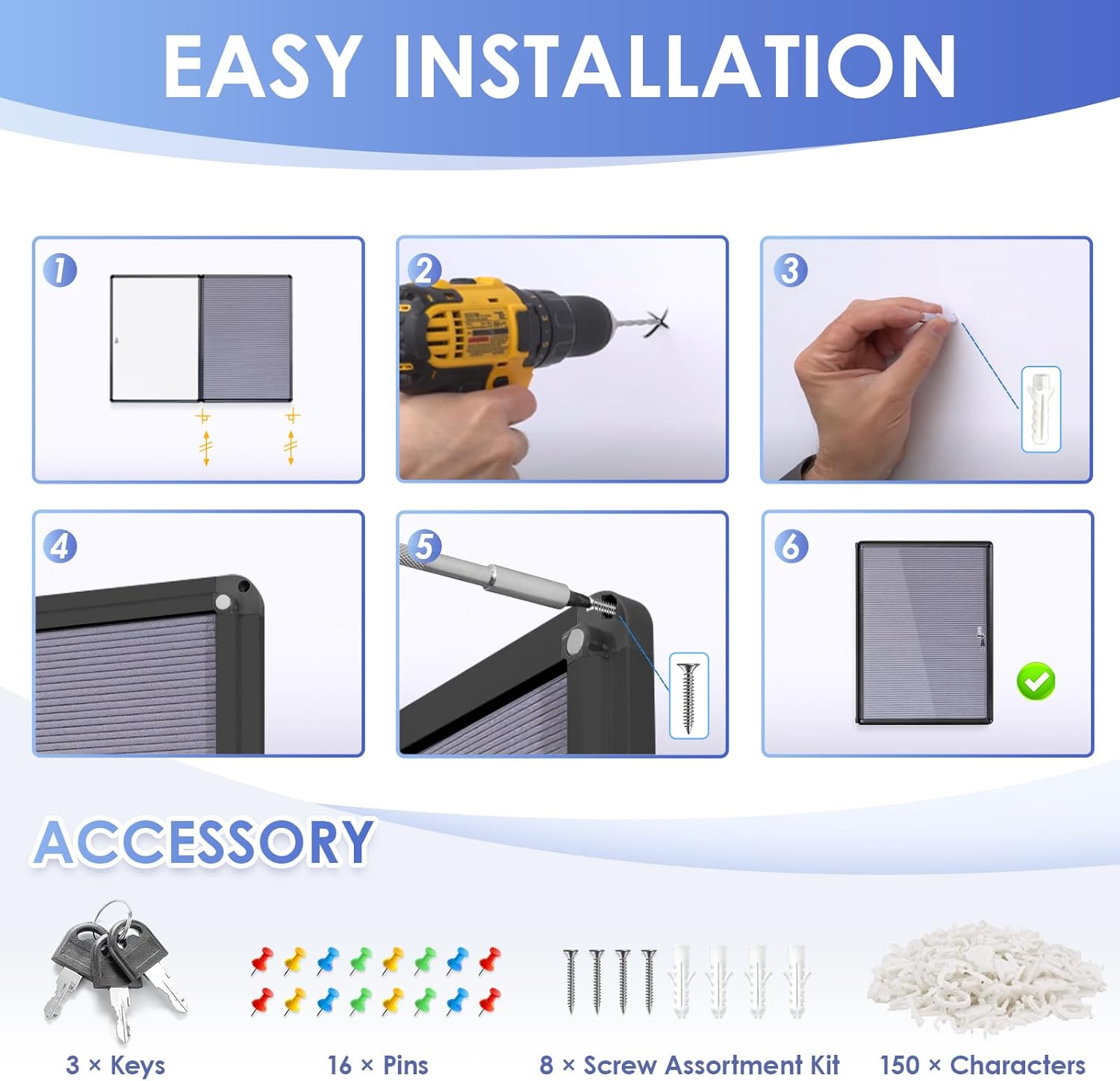 - 🔠 Integrated Letter Board — Includes 147 letters for customizable information. Great for meeting, menus, announcements, and more. Letters stay firmly in place without falling (Using single slot letters)