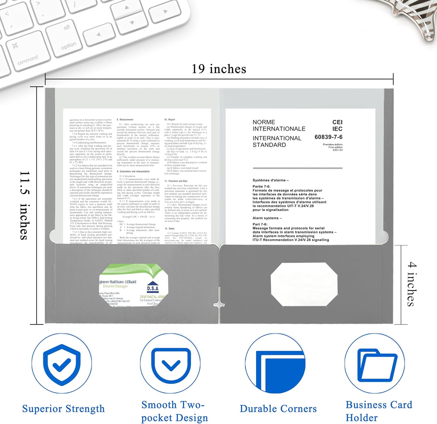 - PROFESSIONAL DESIGN: Two pockets provide storage space for paper, brochures, and more. Each folders for documents measures 9" x 11.5", with two 4" pockets, holds (over 100) sheets of paper, and has a universal business card holder on the right pocket.