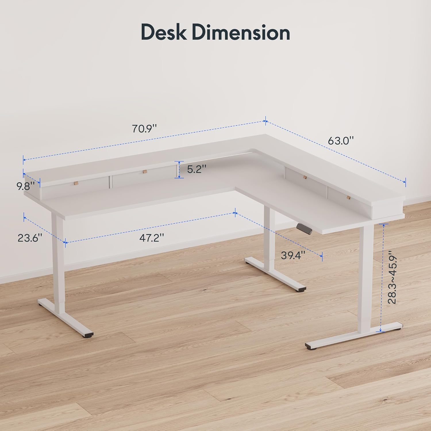 FLEXISPOT 71" Large L Shaped Standing Desk Electric Corner Table with Shelf, 4 Storage Drawers, Adjustable Computer Workstation for Home, Office, Game, Studio, White Top + White Frame
