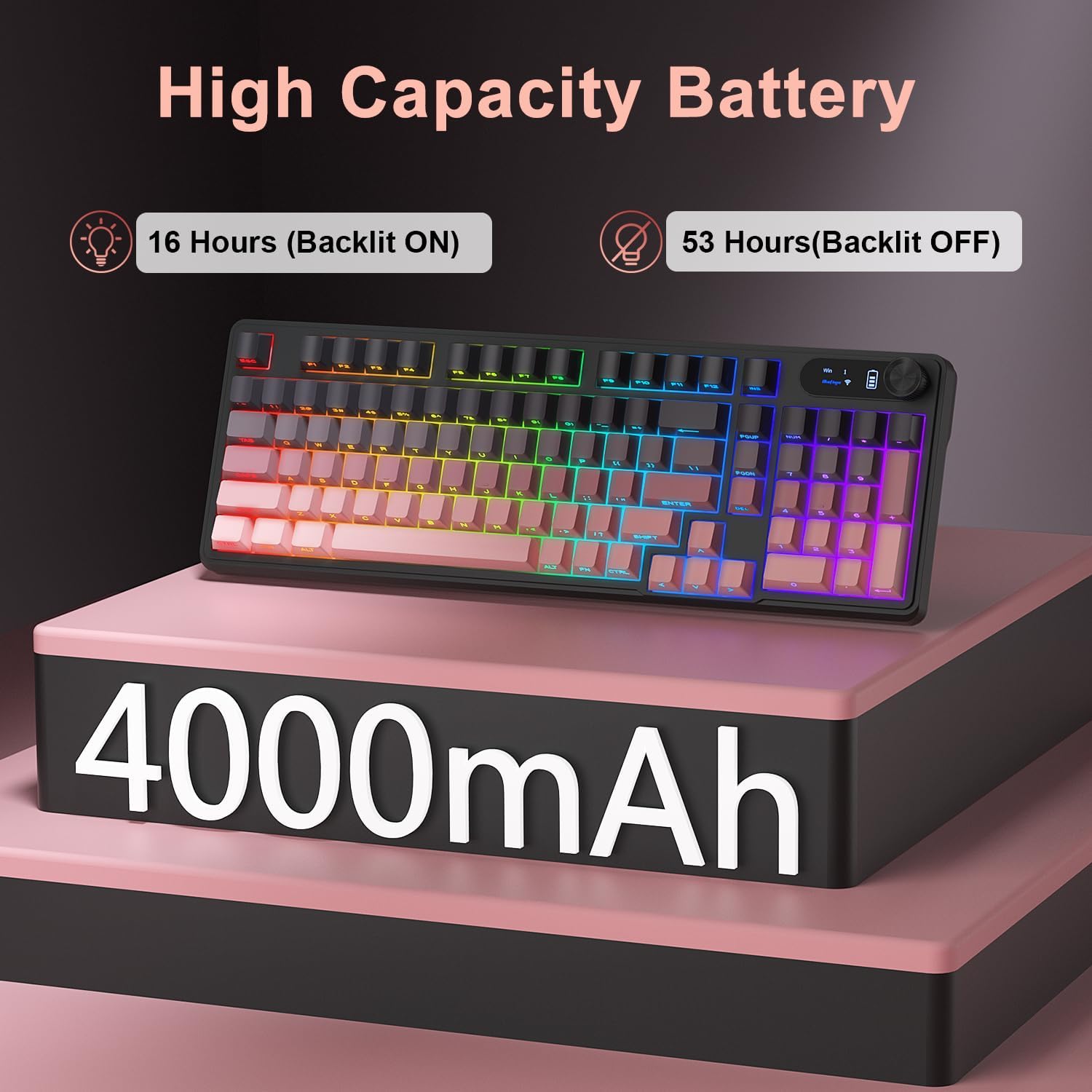 BlueFinger Wireless Gaming Keyboard, RGB Backlit, Tri-Mode Bluetooth/2.4G/USB-C, 98 Keys Quiet Keyboard with Number Pad, Volume Knob & Screen, Side Printed PBT Keycaps for PC/Mac/Laptop