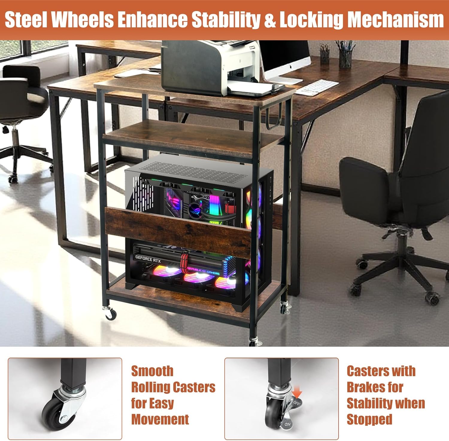 - Spacious & Adjustable Design – This 34.3" extra-large computer & machine cart features a height-adjustable middle shelf (6.9"-24.5") to fit full, mid, and mini towers. The versatile 3-tier computer tower stand design provides ample storage for printers, paper, and office supplies.