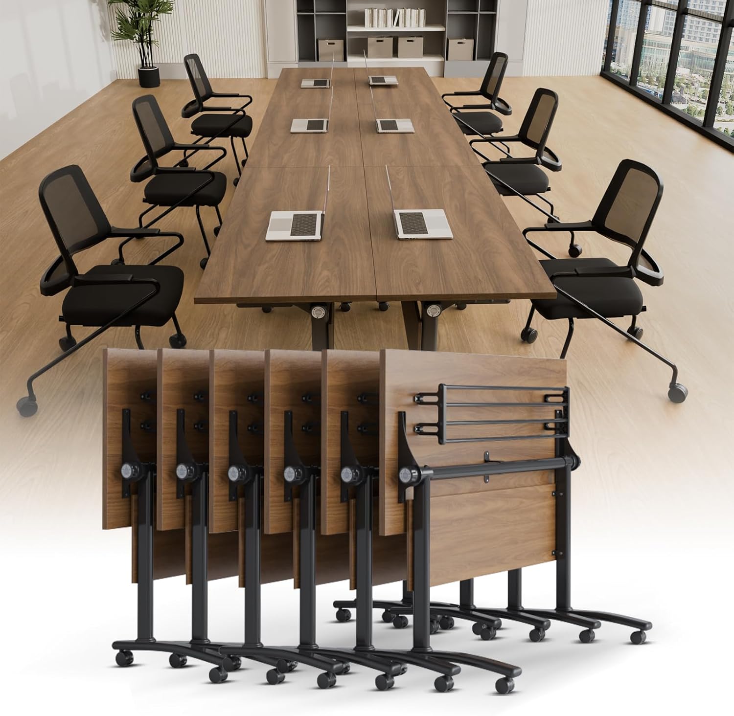 - [Modern and Simple Conference Tables ]: This walnut olored conference room table has a calm tone without losing its vitality, which perfectly matches the modern and simple style. Whether it is you, a partner or a customer, the warm and smooth desktop can make you feel comfortable and relaxed. Compared with traditional office conference table, the biggest feature of this is that it is foldable, movable and can be assembled in multiple ways.