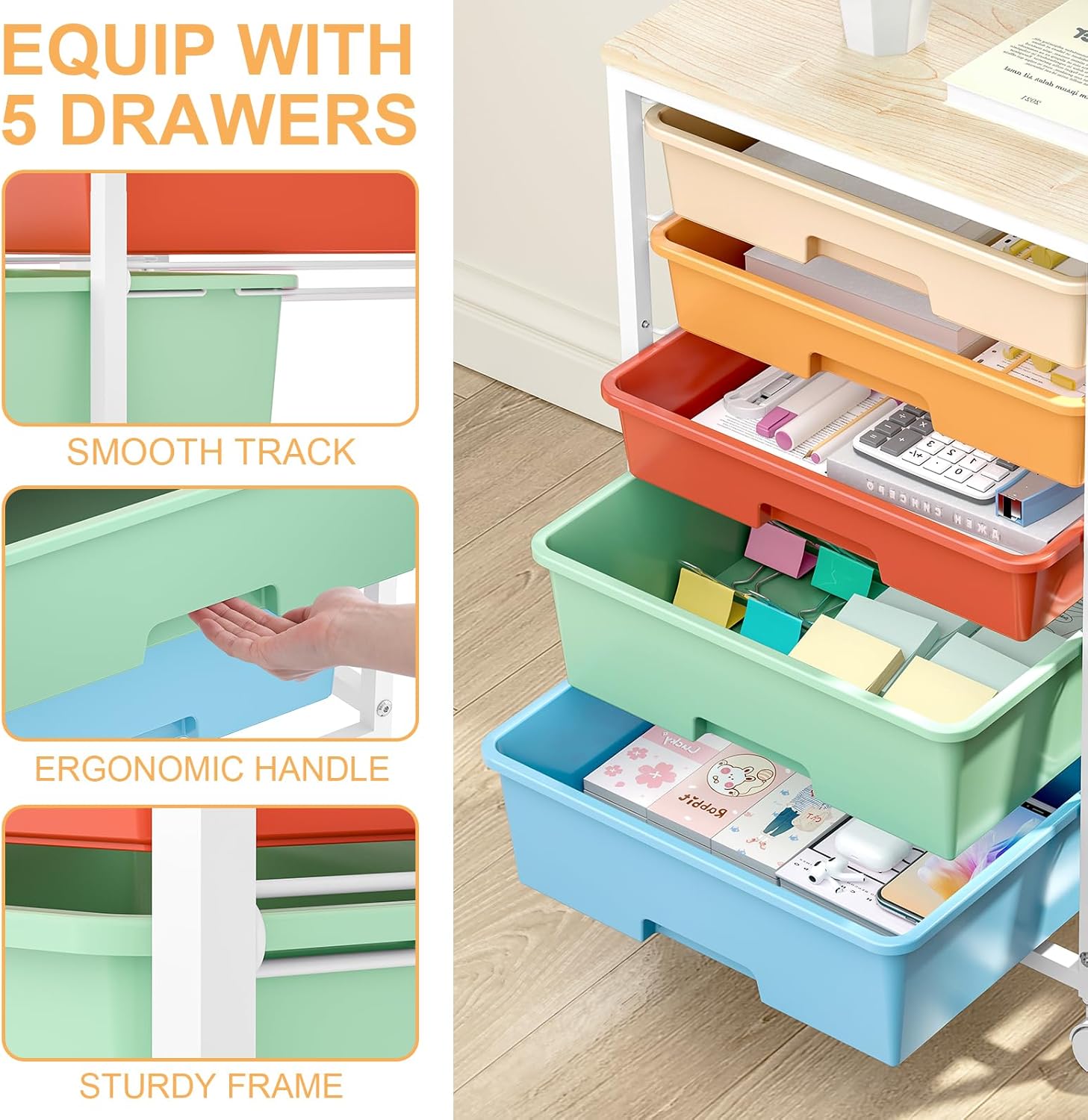 Craft cart,Rolling Cart with Drawers,Storage Cart with 5 Drawers and Wooden Tabletop for Under Desk Organizers and Storage,Macaron