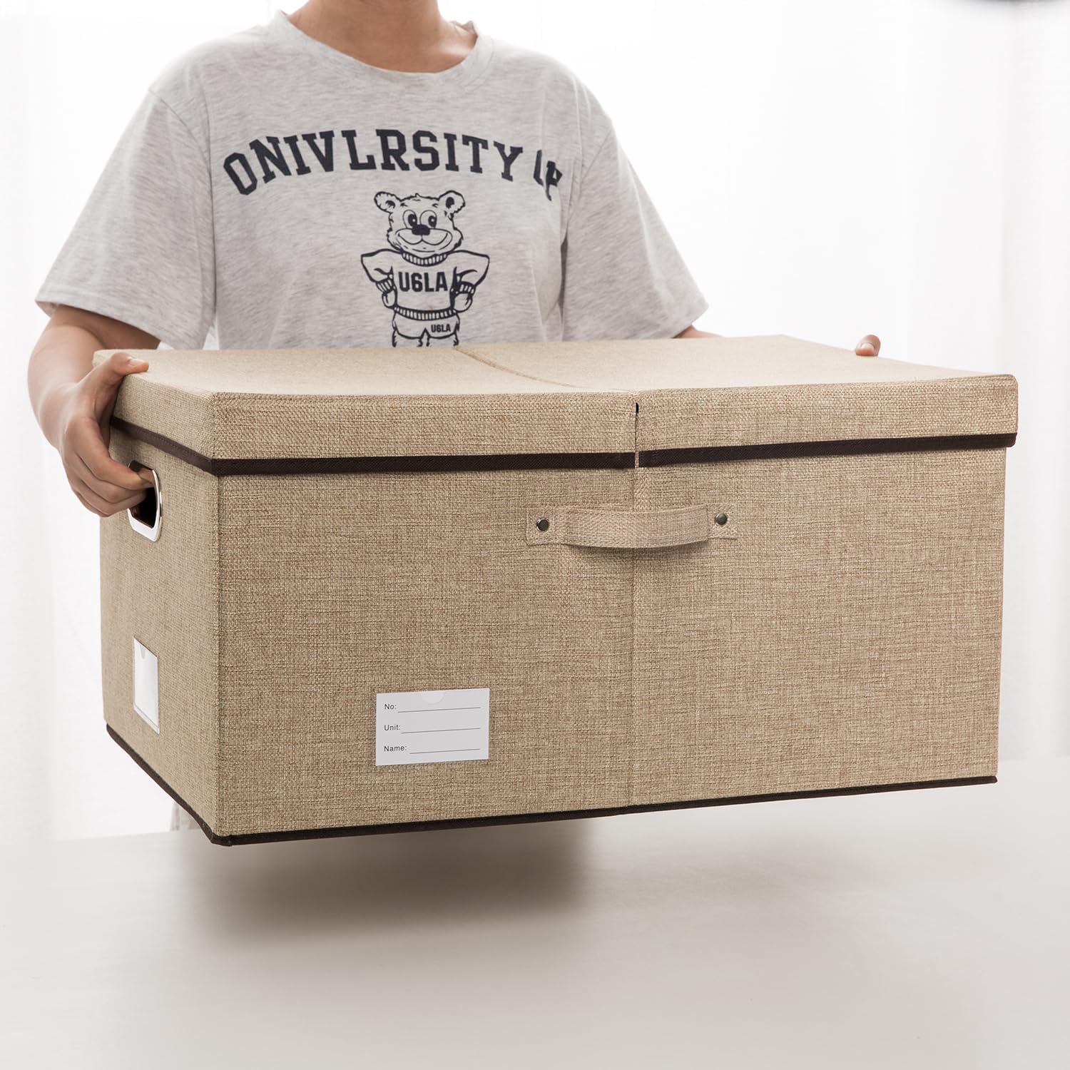 PRANDOM Storage Bins with Lids [3-Pack] Jute Fabric Foldable Storage Boxes Organizer Containers Baskets Cube with Cover for Home Bedroom Closet Office Nursery khaki(23.4X15.9X11.5