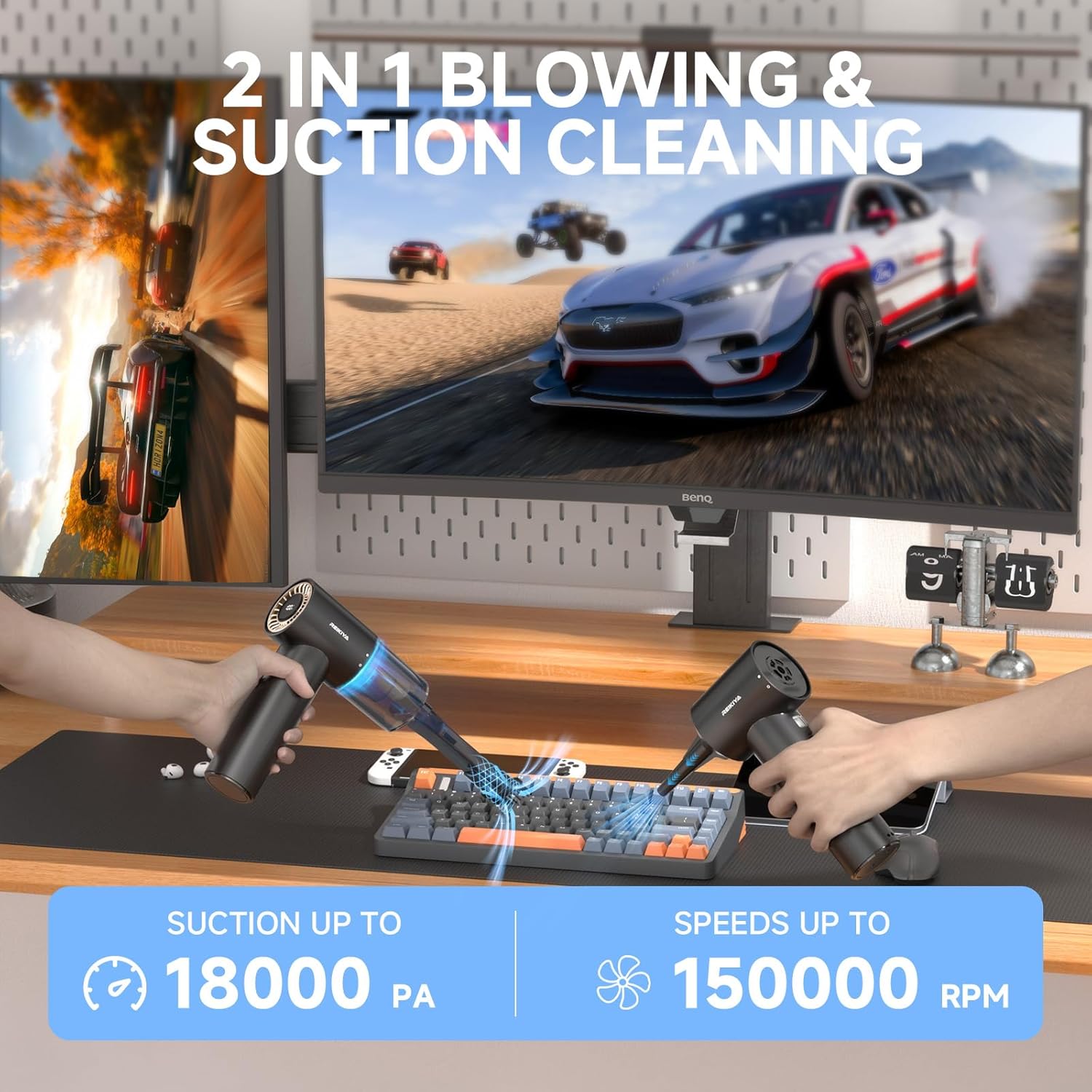- 【3-IN-1 BLOWER+VACUUM+PUMP】Blow & Suck—All in One! To be the compressed air blower mode for gently blowing away particles from intricate components and hard-to-reach areas. Switch to keyboard vacuum cleaner it can effectively eliminate dust and debris from car seats, and tight spaces effortlessly. Additionally, it doubles as a cordless handheld pump for inflating yoga balls, swimming ring rings, ect