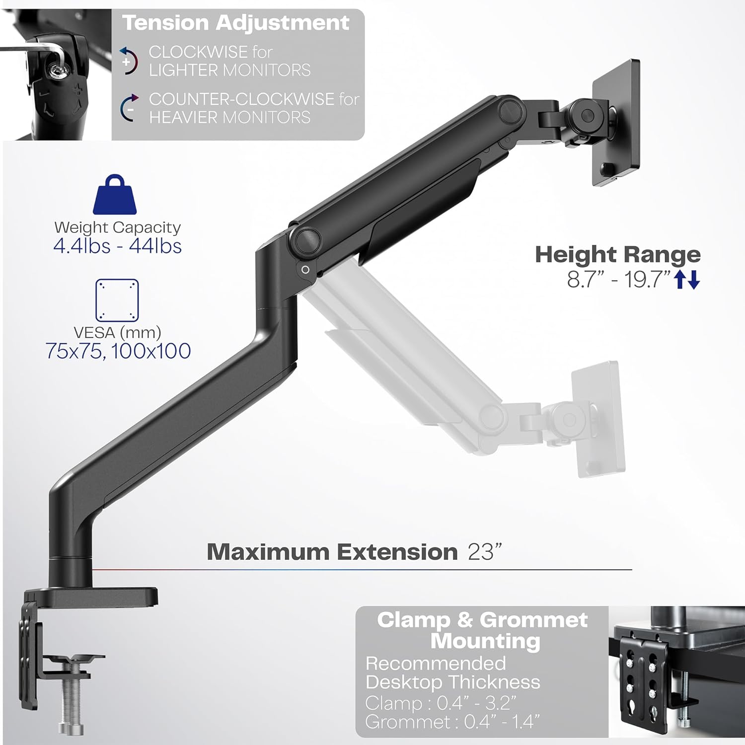 - Tension Arm Mount: Premium spring-assist arm counterbalances the weight of your monitor for optimal ergonomic height adjustments. Ideal for gaming setups, this heavy-duty mount repositions large screens at the touch of a hand