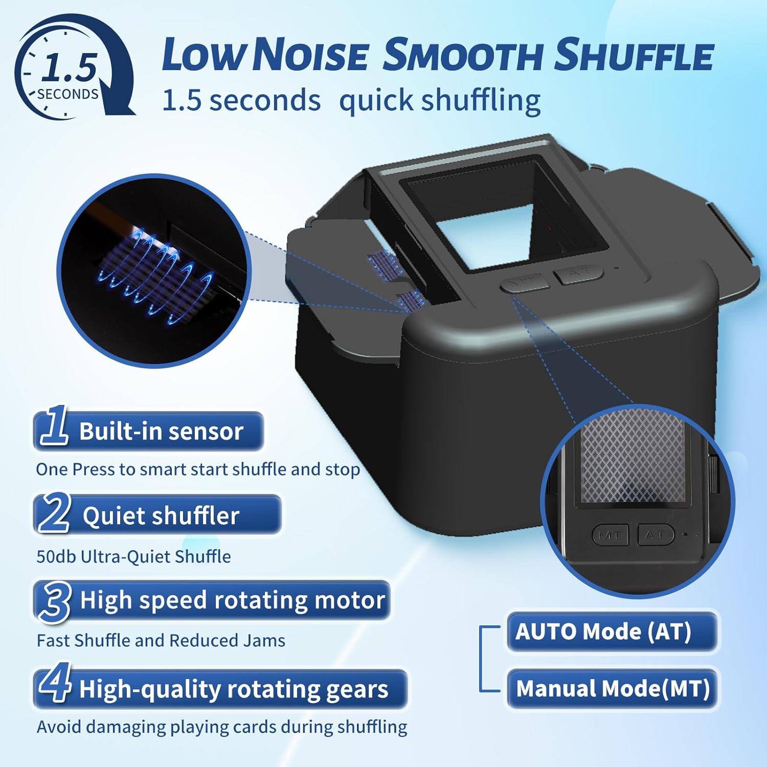 - 【Low Noise and Fast Shuffle】The new upgraded high-speed silent motor will not cause card jamming or misalignment. Avoid the damage of cards due to bending of cards in traditional shuffling methods. The shuffling sound is as low as 50db, allowing you to focus on the game without being disturbed by loud shuffling noise. It only takes 1-2 seconds to shuffle 2 decks of cards, greatly improving the shuffling efficiency. You can better enjoy the home game night.