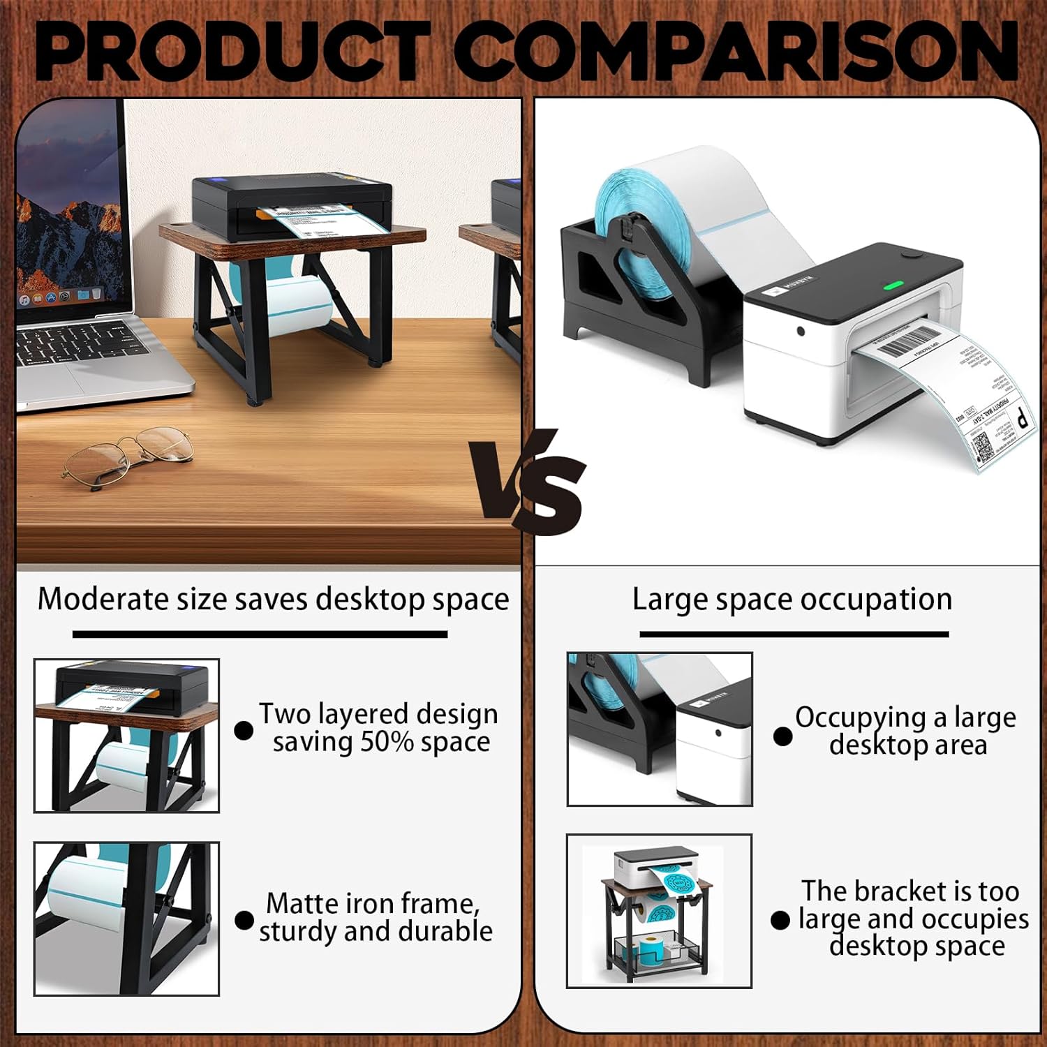 - Space-saving & Right-sized: The thermal label holder measures 9.45" x 6.30" x 7.08" (24 x 16 x 18 cm). Its innovative double-decker construction provides space for most thermal printers while reclaiming over 50% of desktop real estate.