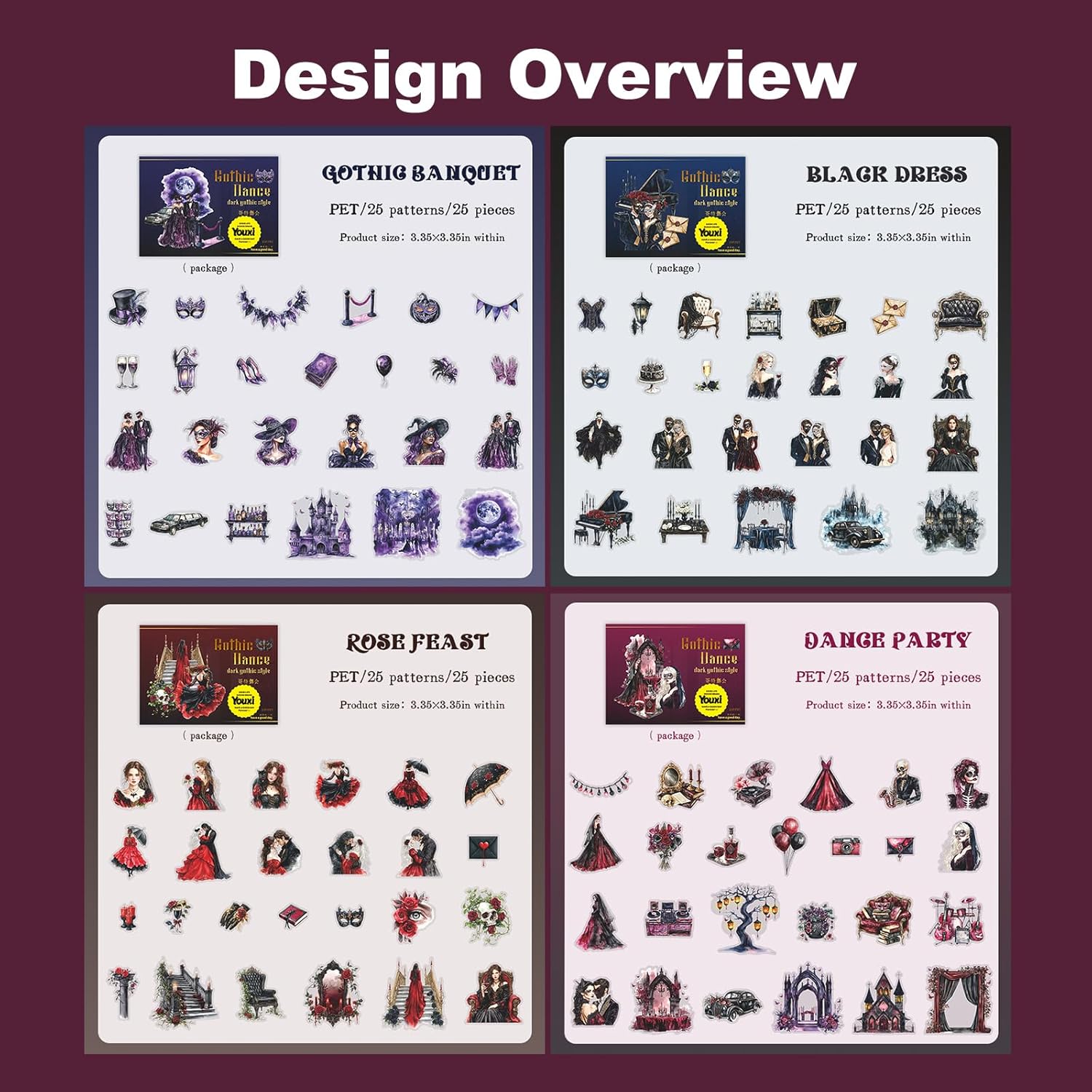 - Gothic Dance-Themed Variety: Includes 4 dark gothic styles—Gothic Banquet, Black Dress, Rose Feast, and Dance Party—with 25 unique designs each. Adds dramatic, romantic atmosphere to scrapbooks, journals, and visual collages