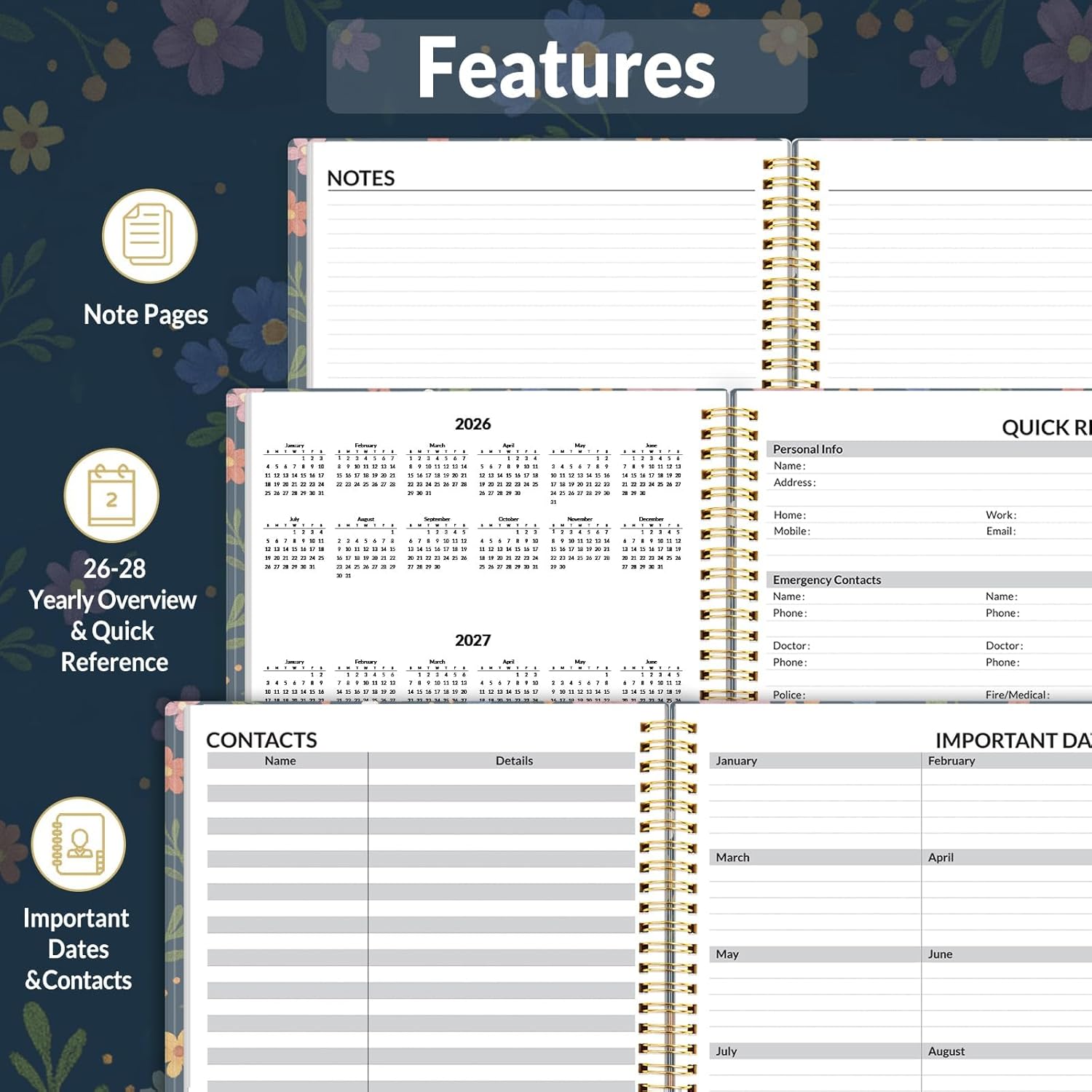 SUNEE 2026 Appointment Book, Quarter-Hourly, Weekly & Monthly - from January 2026 - December 2026, 8.5"x11" Weekly Planner, Flexible Cover, Note Pages, Pockets, Bookmark, Spiral Binding, Navy Flower