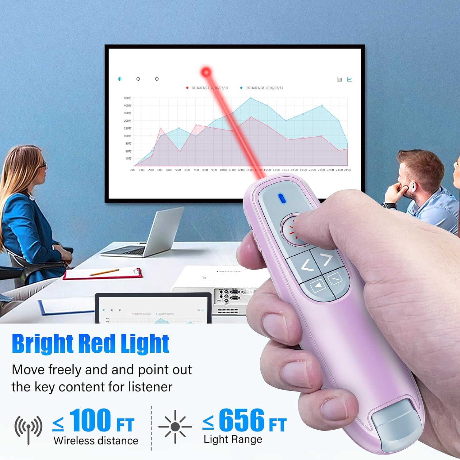 - BRIGHT RED LIGHT & LONG RANGE CONTROL: The slide advancer with pointer possess bright red light which is easy to be seen clearly against most background(Not recommended for TV/LED/LCD screens), to highlight and point out the key part to for audience. The wireless remote control range of the slide clicker is up to 100ft while the red light range is up to 656ft, which allows you to stroll around effortlessly and mingle with your audiences for greater impact in a large space.