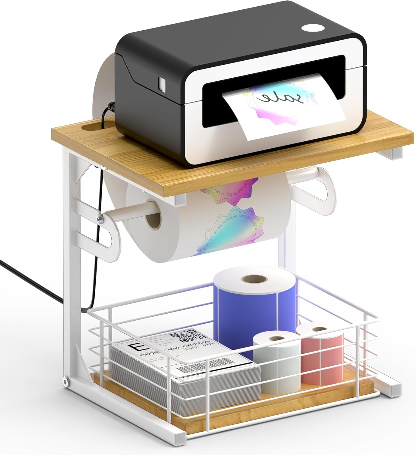 - 【ALL-IN-ONE Multifunctional Label Holders】 Designed specifically for the efficient storage of labels and printers, this holder features holes on both sides of the upper section to organize the printer’s power cable or other accessories. The bottom drawer offers additional storage space for office supplies, including tapes, labels, and other items.
