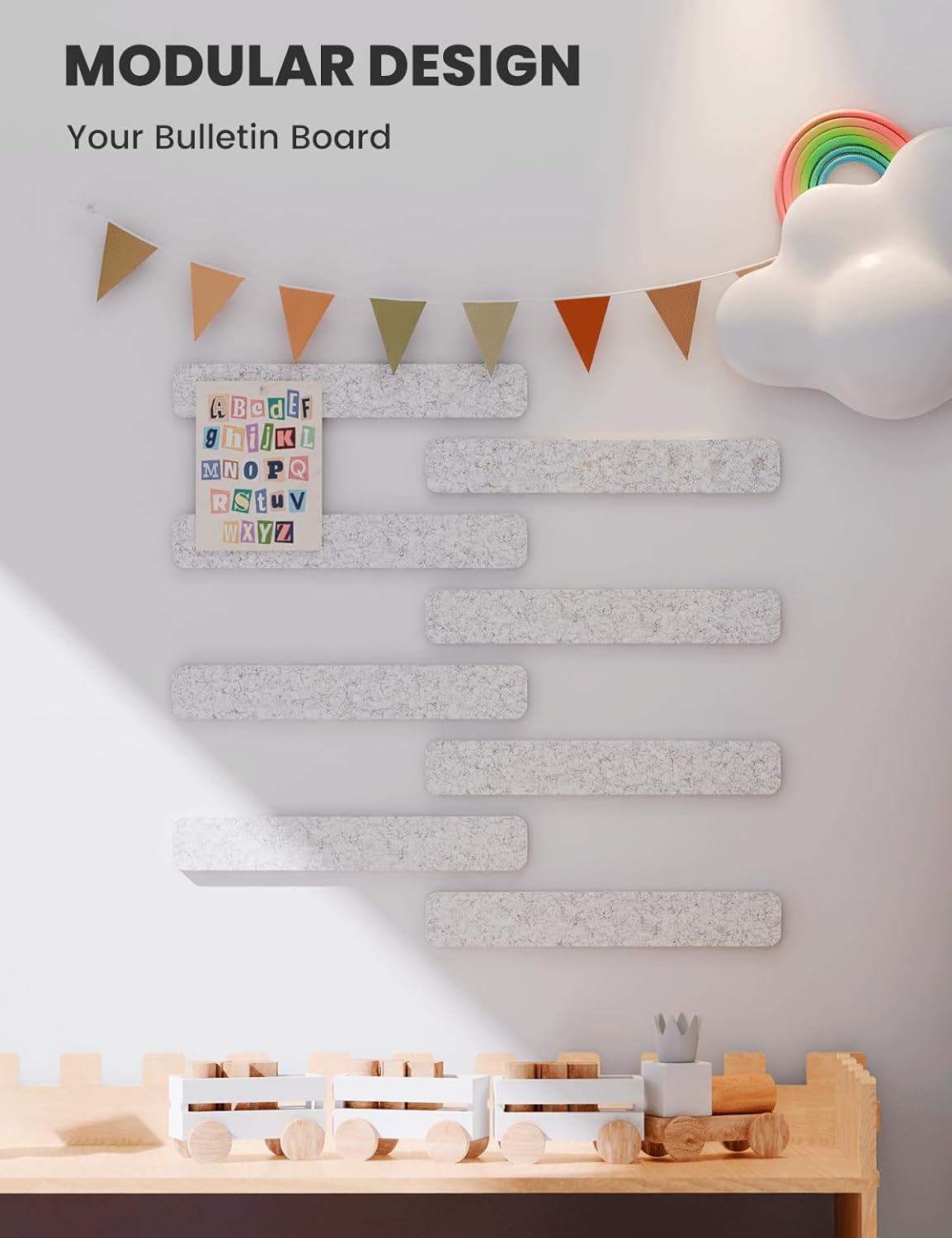 - 【Compact & Slim Design】Each felt strip features an ultra-slim 13"x2"x0.35" design with 50 push pins, 30 adhesive pads, and 7 wooden clips included—create unique bulletin boards at home, office, or dorm to unleash your creativity and personalize any space.