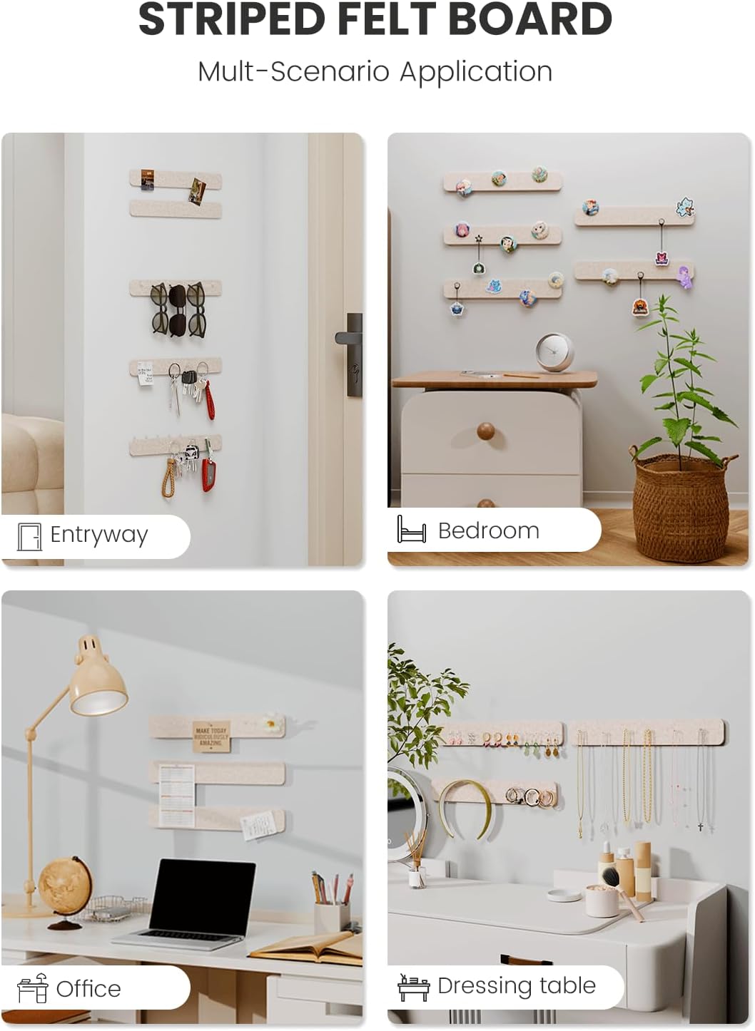 - 【Customizable & Gift-Ready】Felt boards securely hold notes and memos, display photos and recipes for daily inspiration, hang keys and eyewear essentials, and organize jewelry like earrings, hair ties, and necklaces—transforming walls into creative decorative spaces.