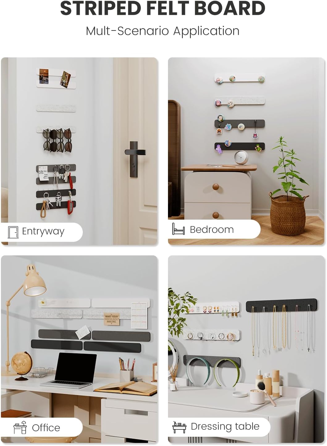 - 【Customizable & Gift-Ready】Felt boards securely hold notes and memos, display photos and recipes for daily inspiration, hang keys and eyewear essentials, and organize jewelry like earrings, hair ties, and necklaces—transforming walls into creative decorative spaces.
