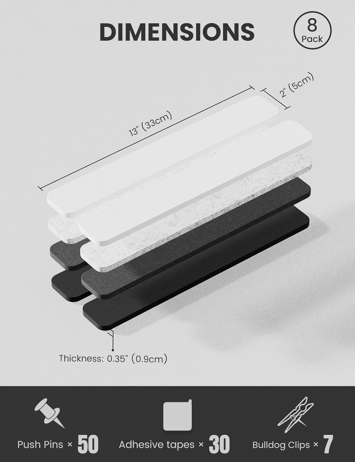 - 【Compact & Slim Design】Each felt strip features an ultra-slim 13"x2"x0.35" design with 50 push pins, 30 adhesive pads, and 7 wooden clips included—create unique bulletin boards at home, office, or dorm to unleash your creativity and personalize any space.