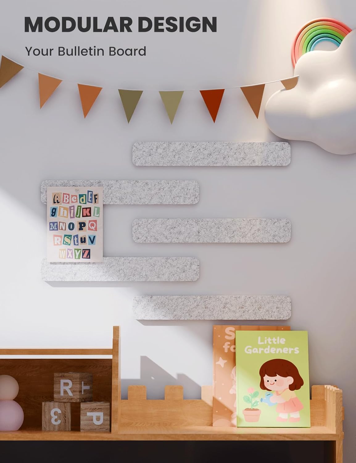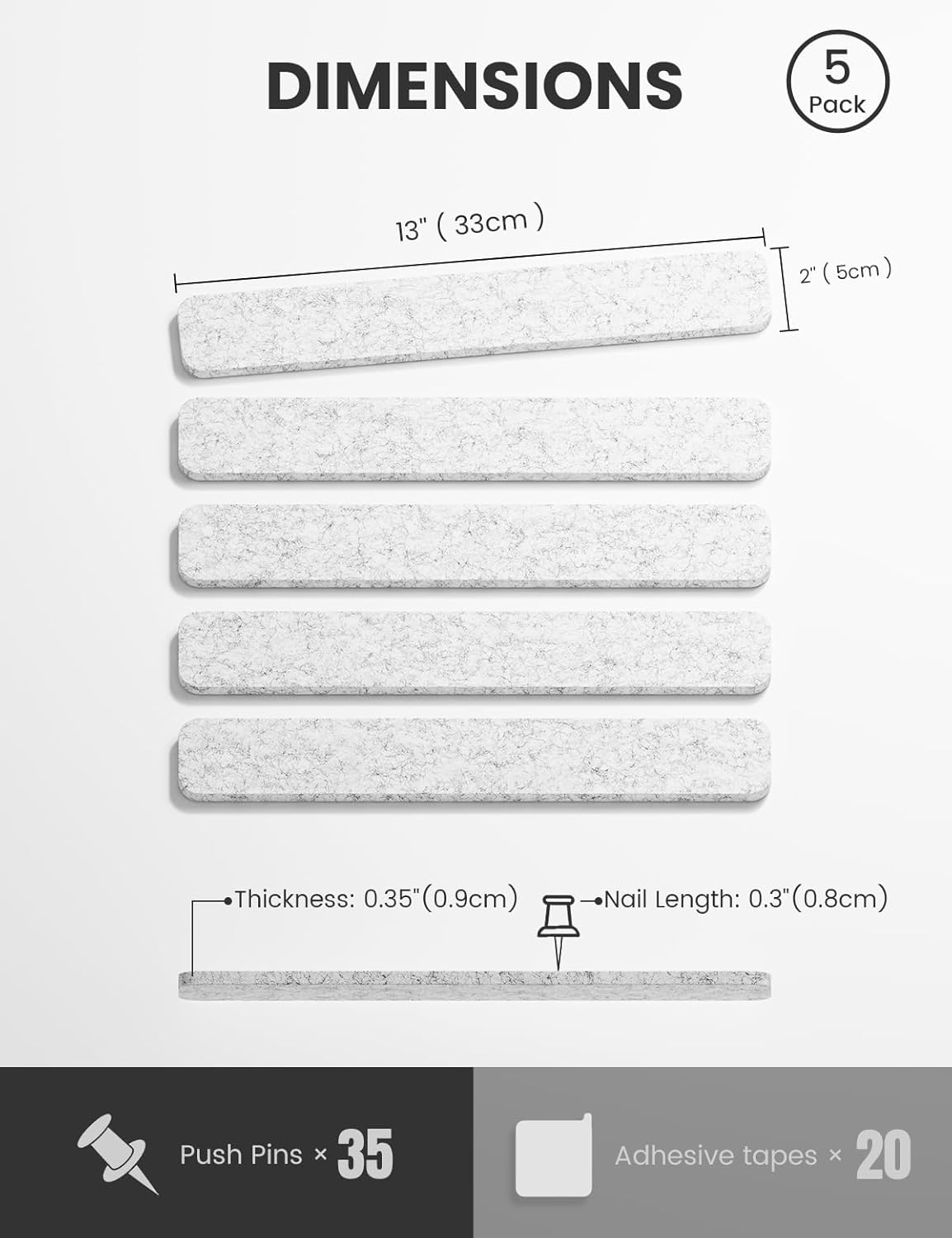 - 【Compact & Slim Design】Each felt strip features an ultra-slim 13"x2"x0.35" design with 35 push pins and 20 adhesive pads included—create unique bulletin boards at home, office, or dorm to unleash your creativity and personalize any space.