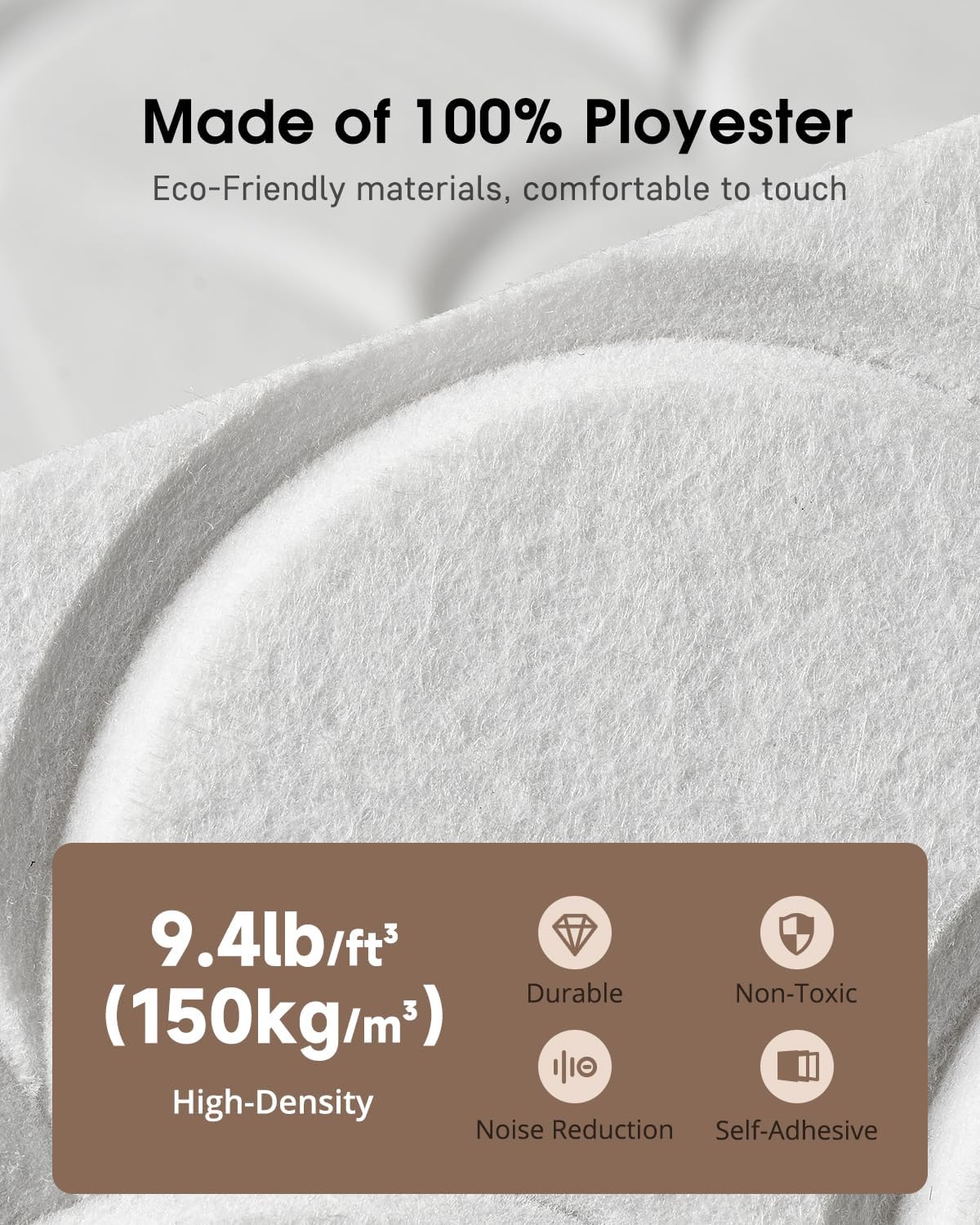 - 【High-quality Safe Materials】This acoustic wall panels is made from 100% high-density polyester, which is non-toxic and odorless, with a velvety, skin-friendly surface. Sound proof panels for walls is safe for use in sensitive environments like recording studios. The high-density structure of the sound dampening panels at 150kg/m³ ensures durability and effectively absorbs both high- and low-frequency noise, providing a safe, healthy, and comfortable living environment for you and your family.