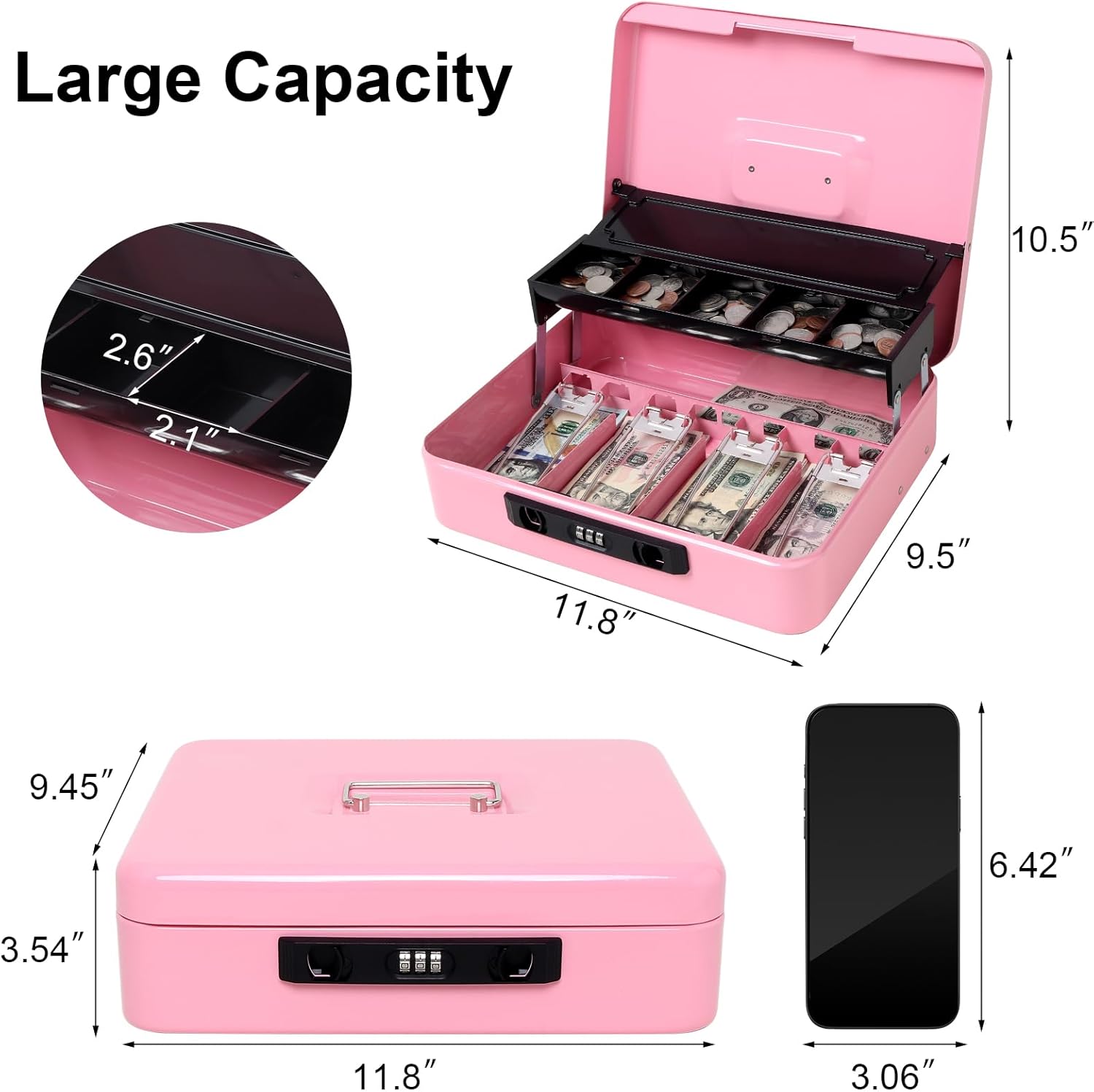 Jssmst Locking Cash Box with Coin Lid, 11.8L x 9.5W x 3.5H Inches, Latch Safe Money Box with Combination Lock, Pink