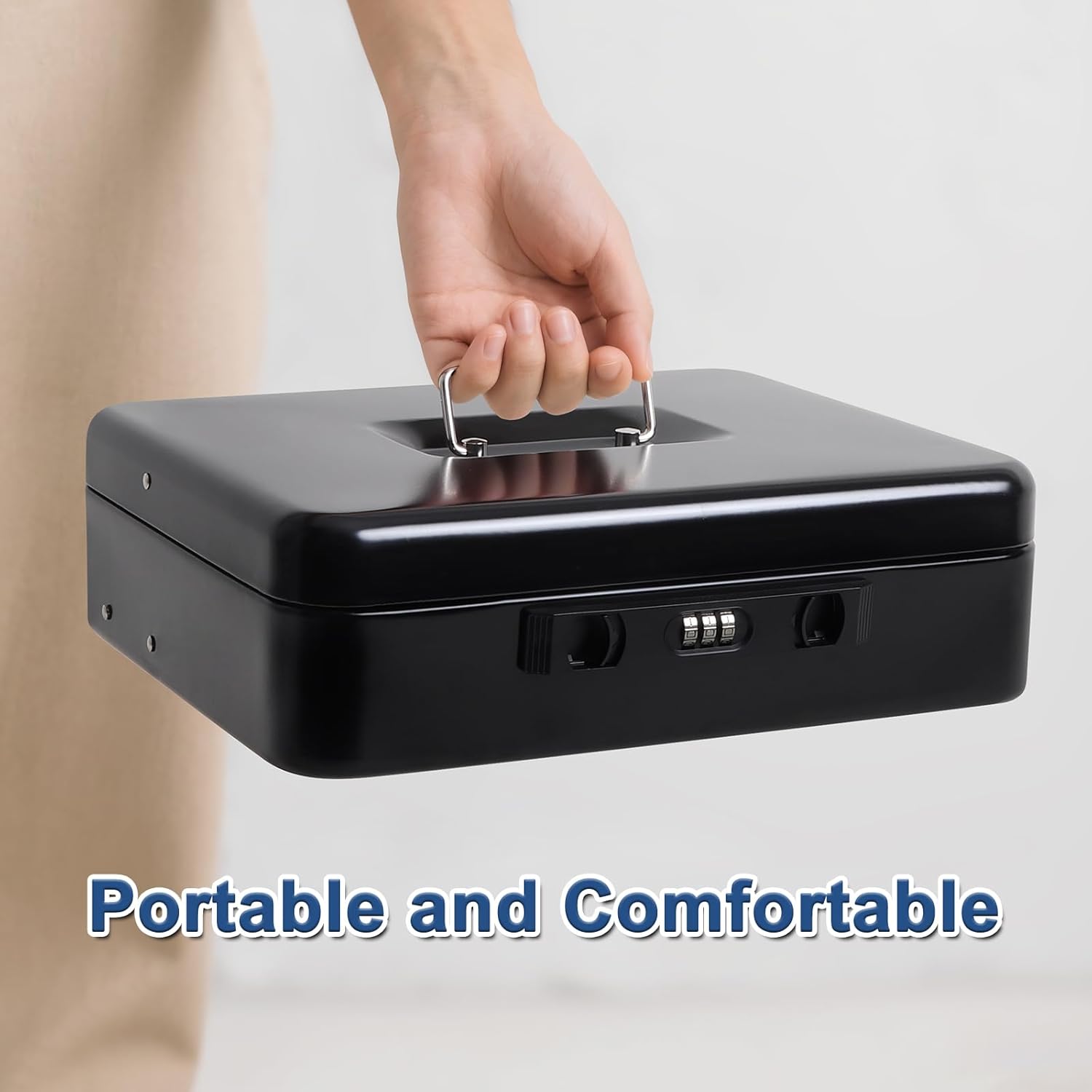 Jssmst Locking Cash Box with Coin Lid, 11.8L x 9.5W x 3.5H Inches, Latch Safe Money Box with Combination Lock, Black