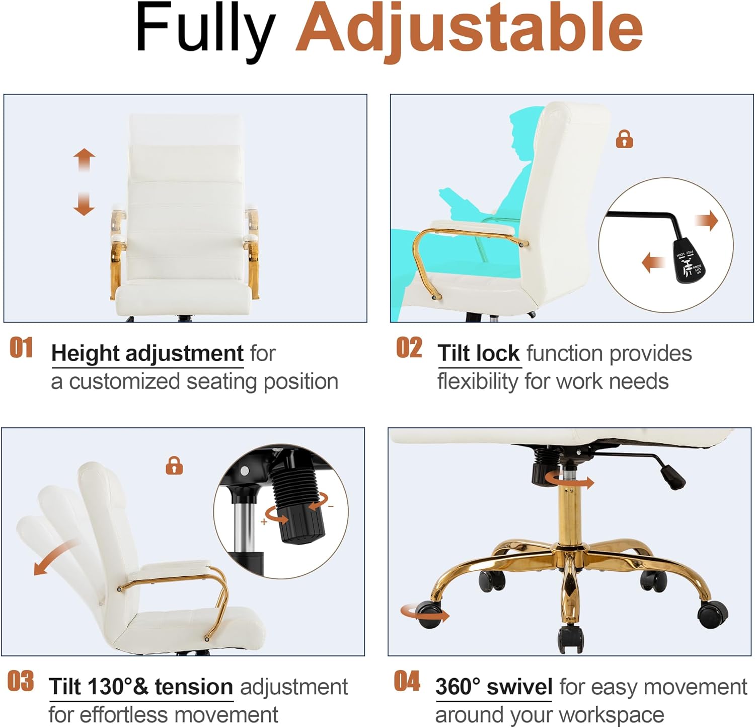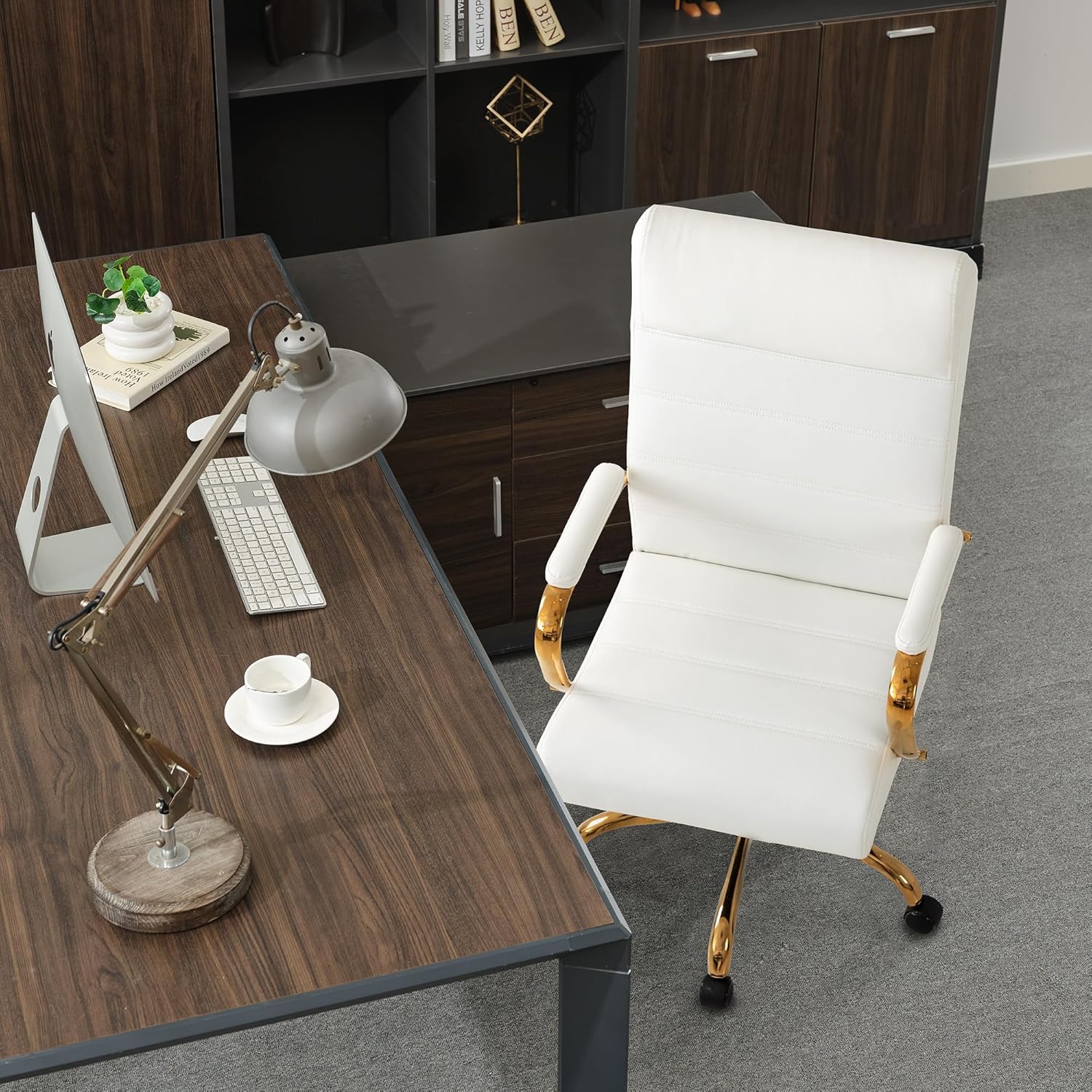 Office Desk Chair,Modern Leather Conference Room Chairs,High Back Home ofiice Chair,Adjustable Height Swivel Executive Computer Chair with Padded Seat and Armrest (White with Gold Frame)