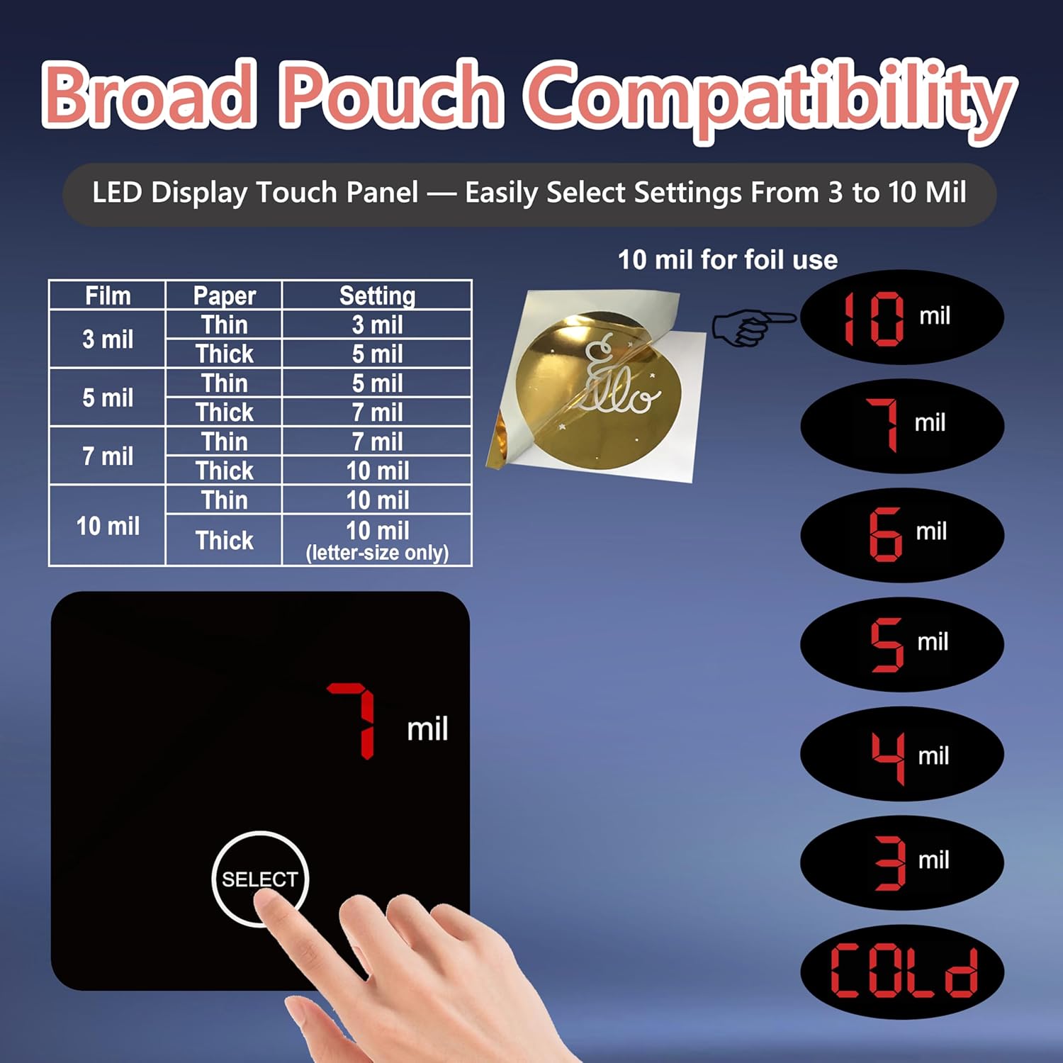 - 【LED Display Touch Panel】Easily select the appropriate setting based on pouch thickness with a simple, beginner-friendly one-touch control. Setting recommendations according to sheet and paper thickness are clearly printed on the machine for quick reference and ease of use.