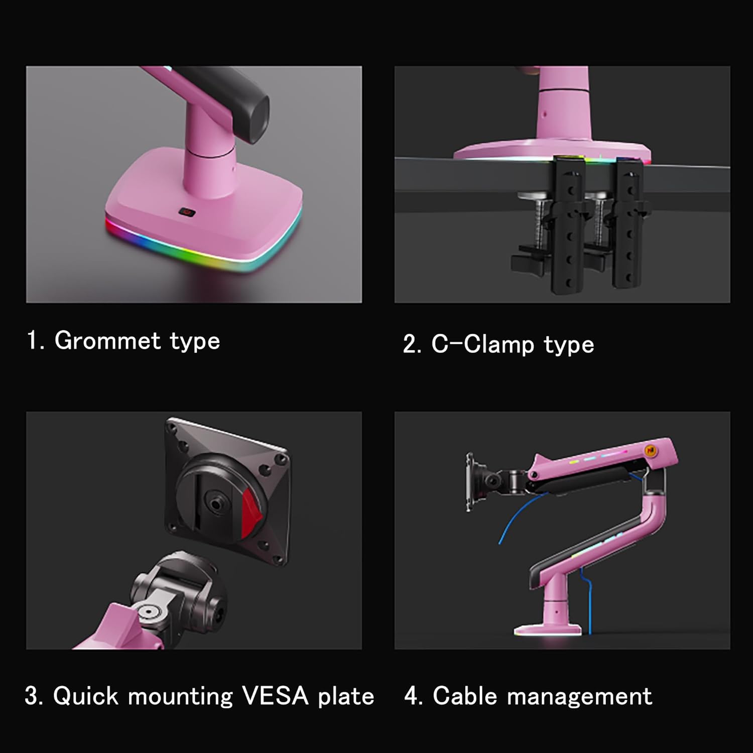 NB Gaming Monitor Arm or for 32 to 60 Inches Screen, Load up to 20 kg, VESA 75/100, RGB-Light, Heavy Duty, Multi Angle Adjustable, Premium Aluminum, Pink