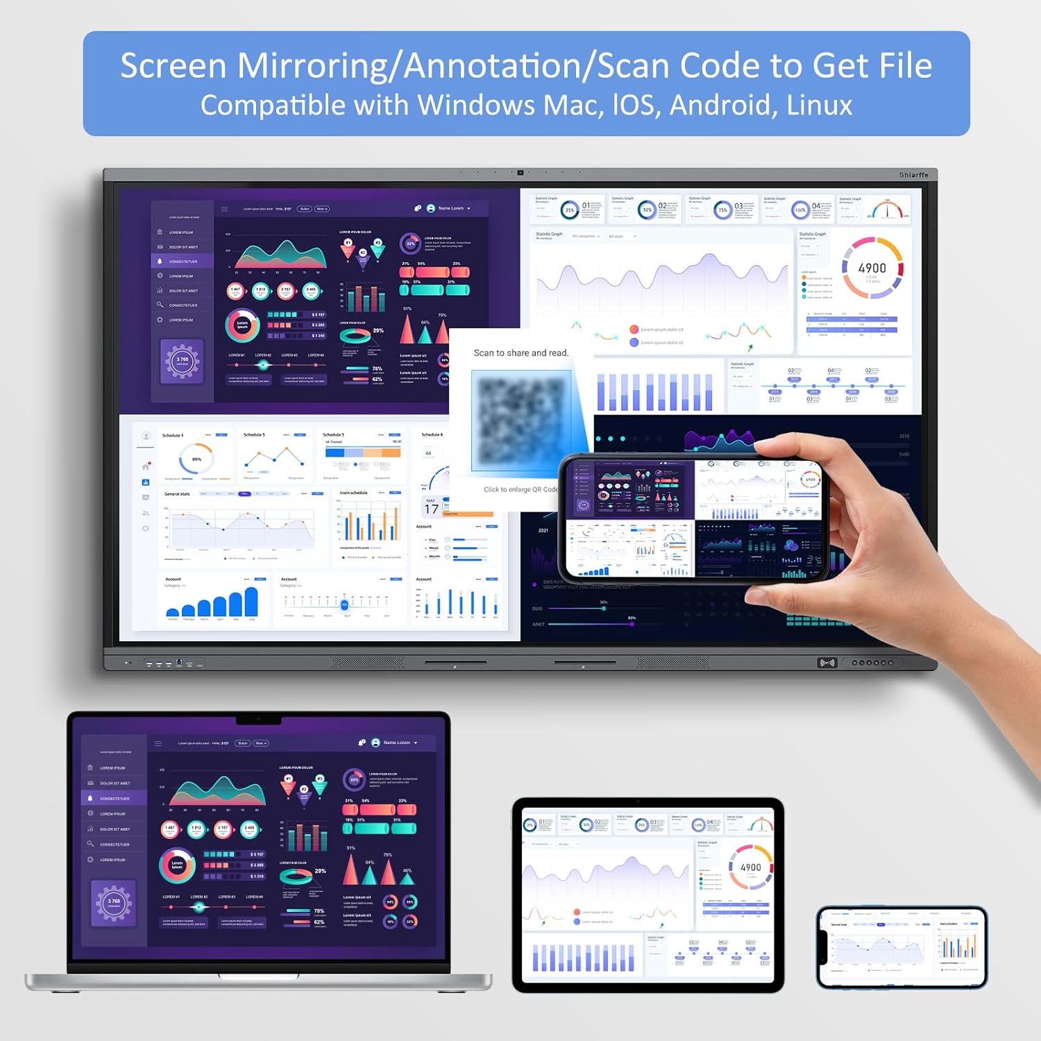 - Effortless Cross-Device Collaboration: smartboard makes collaboration easy with wireless screen mirroring, file sharing, and synced annotations across Android, iOS, Linux, Mac, and Windows. Instantly share notes and documents via QR code, fast and convenient