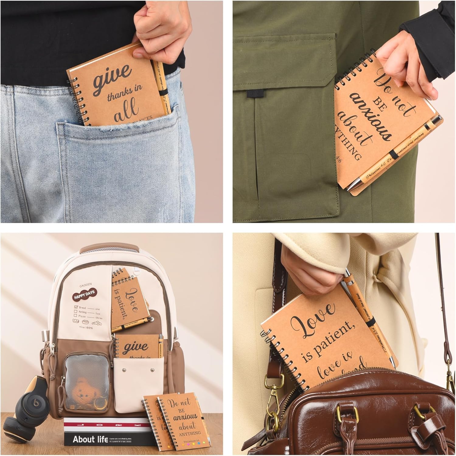 - Scripture Notebook & Pen Set – Includes 3 spiral-bound notebooks and 3 bamboo pens, each featuring a unique Bible verse. Ideal for personal reflection, journaling, or sharing with others.