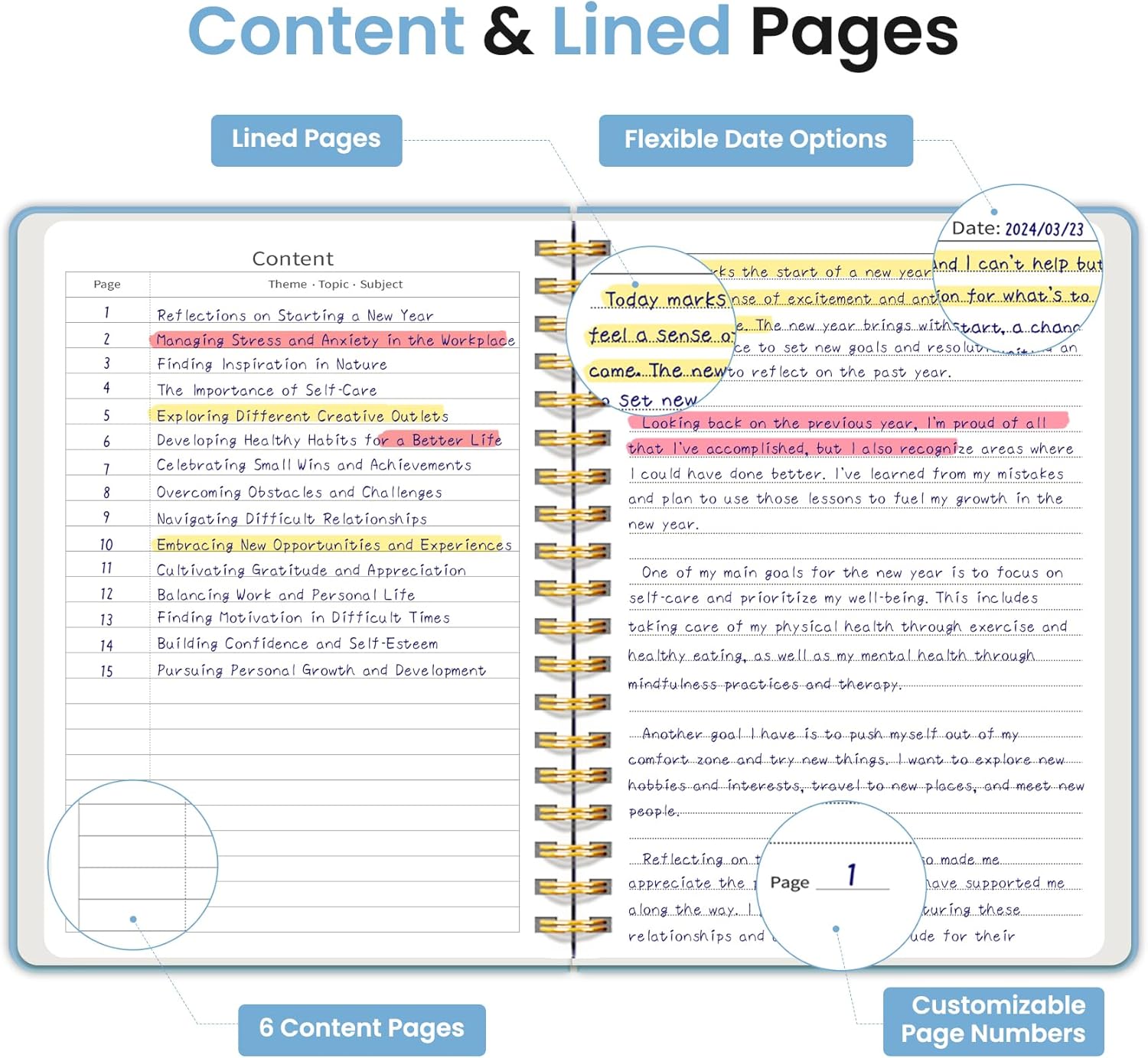 - Structured College-Ruled Pages: Featuring 7mm college-ruled lines, this journal notebook helps keep your writing organized and legible. The evenly spaced lines are perfect for structured notes, work lists, or detailed writing, making it an excellent choice for school students, professionals, and writers alike. It also includes 6 content pages, perfect for creating an index for easy reference.
