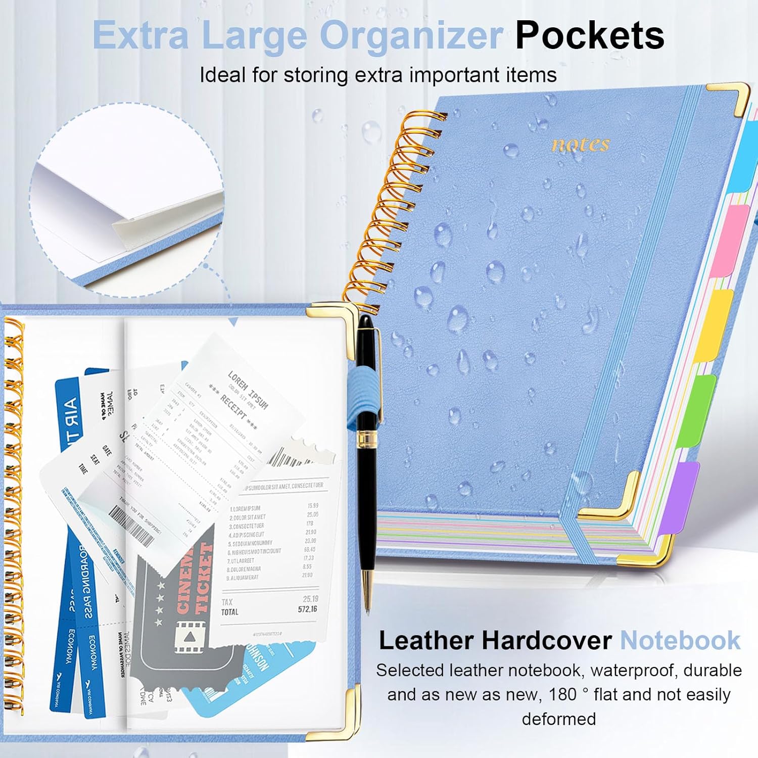 Hardcover Spiral Notebook 8"x10" Journal Notebook with Tabs and Removable Dividers 300 Pages 5 Subject Notebook College Ruled, Faux Leather Spiral Bound Notebook for Women, Students, School Work (Lake Blue)