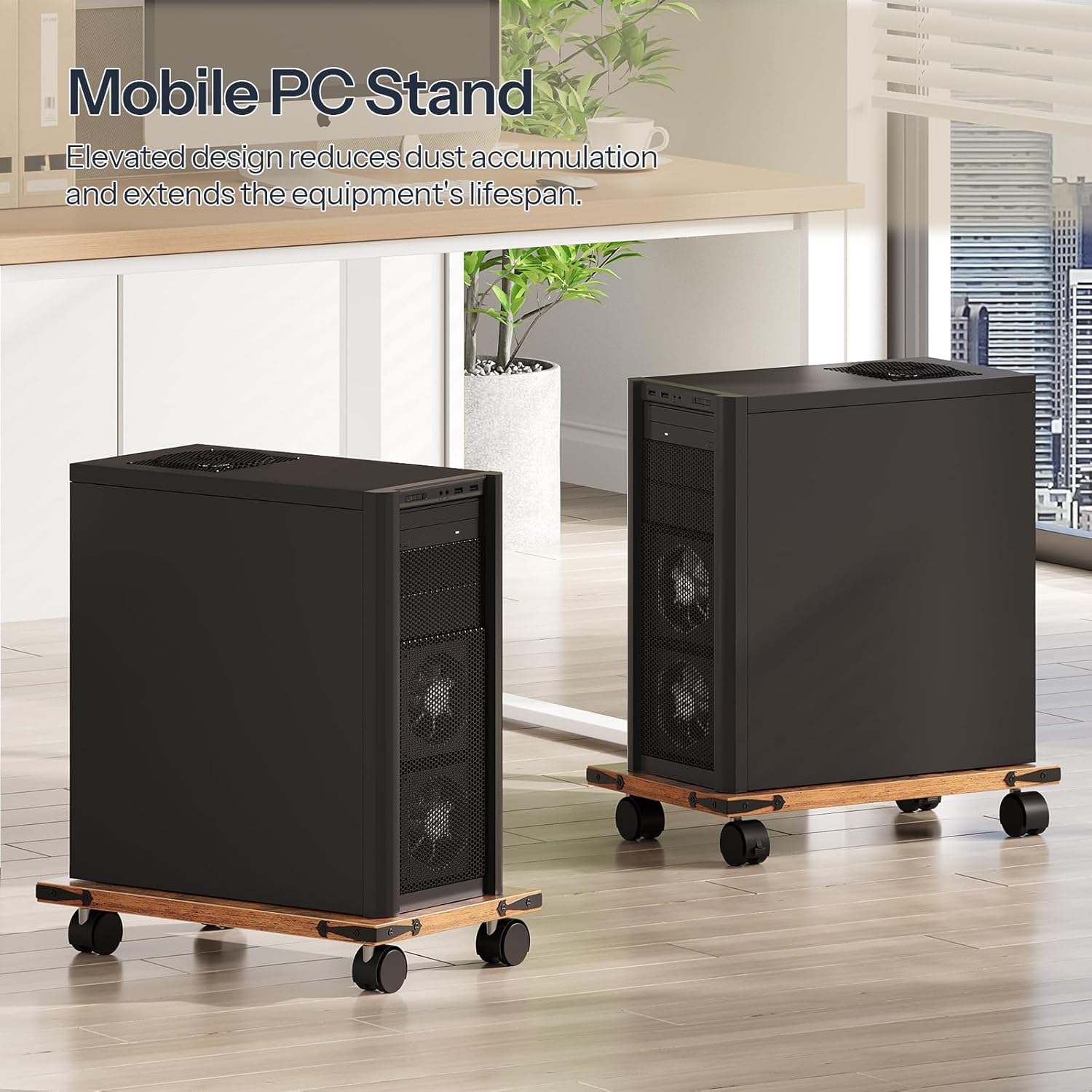 - Smooth Mobility and Secure Fixation: Equipped with four 360° rotating wheels, you can effortlessly position the PC tower holder wherever you want. Two of the wheels feature a locking mechanism to keep the PC stand secure and steady when needed
