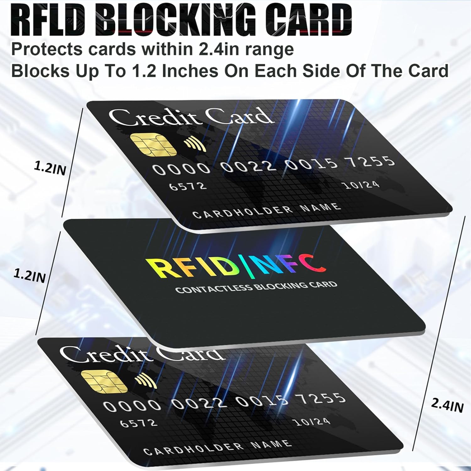 - Universal Fit for All Cards: Compatible with all standard-sized cards, our RFID blocking card features the latest 13.56 MHz RFID/NFC blocking technology. It generates a jamming signal to disrupt radio frequency signals within a 2.4-inch range (1.2 inches on each side), making it the perfect safeguard card for everyday use.