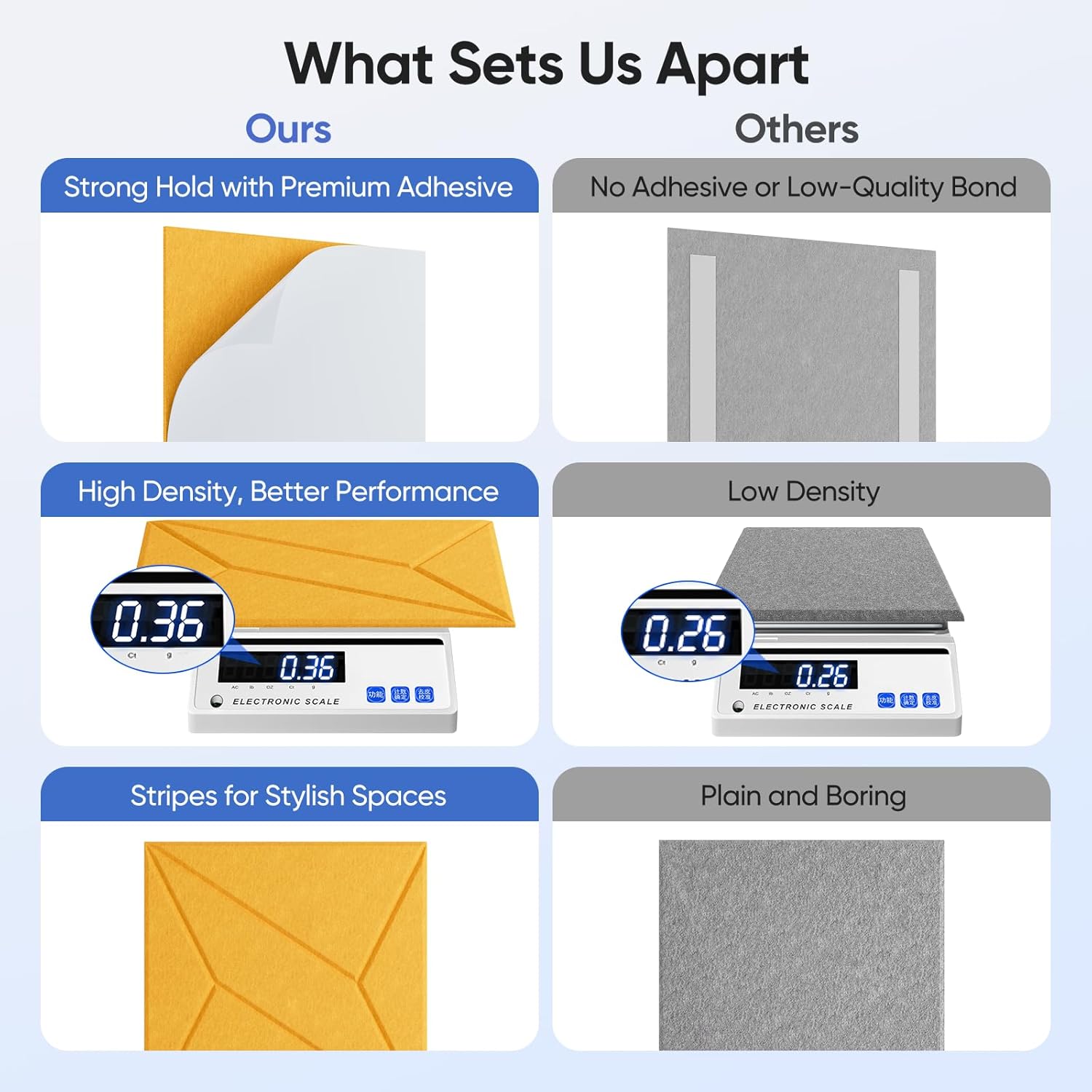 - Effortless Installation -- Each acoustic panel comes with a strong self-adhesive backing—just peel and stick. No tools, nails, or extra adhesives needed.