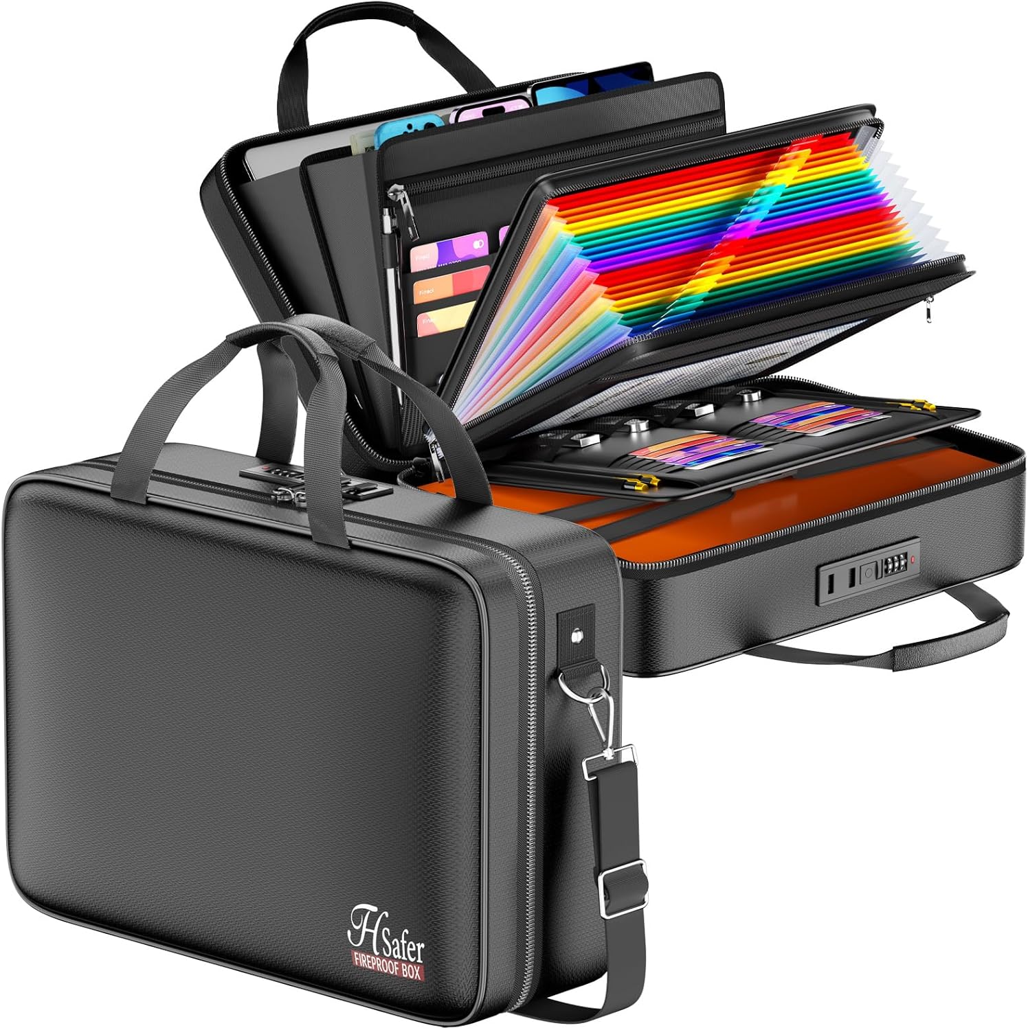 - [Large Capacity Fireproof Safe Box]: This fireproof document organizer measures approximately 15.7 x 11.8x 6.9inches. Its thoughtfully designed interior includes 2 main compartments, a 24 removable accordion file folder, 22 card slots, 2 zipper mesh bags, 4 pen slot, 2 pen clips, 8 usb mesh pockets. The generous space easily holds and keeps organized essential items such as A4/letter/legal files, laptops, passports, currency, certificates, USB drives, and cards