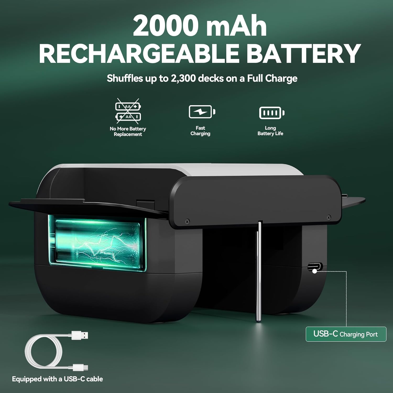 - [Rechargeable] - The poker card shufflerr has a built-in rechargeable battery, eliminating the need for battery replacement, and comes with a USB-C cable. The USB-C charging port supports fast charging, let your shuffler is always ready to use. Note: The automatic shuffler does not work while charging.