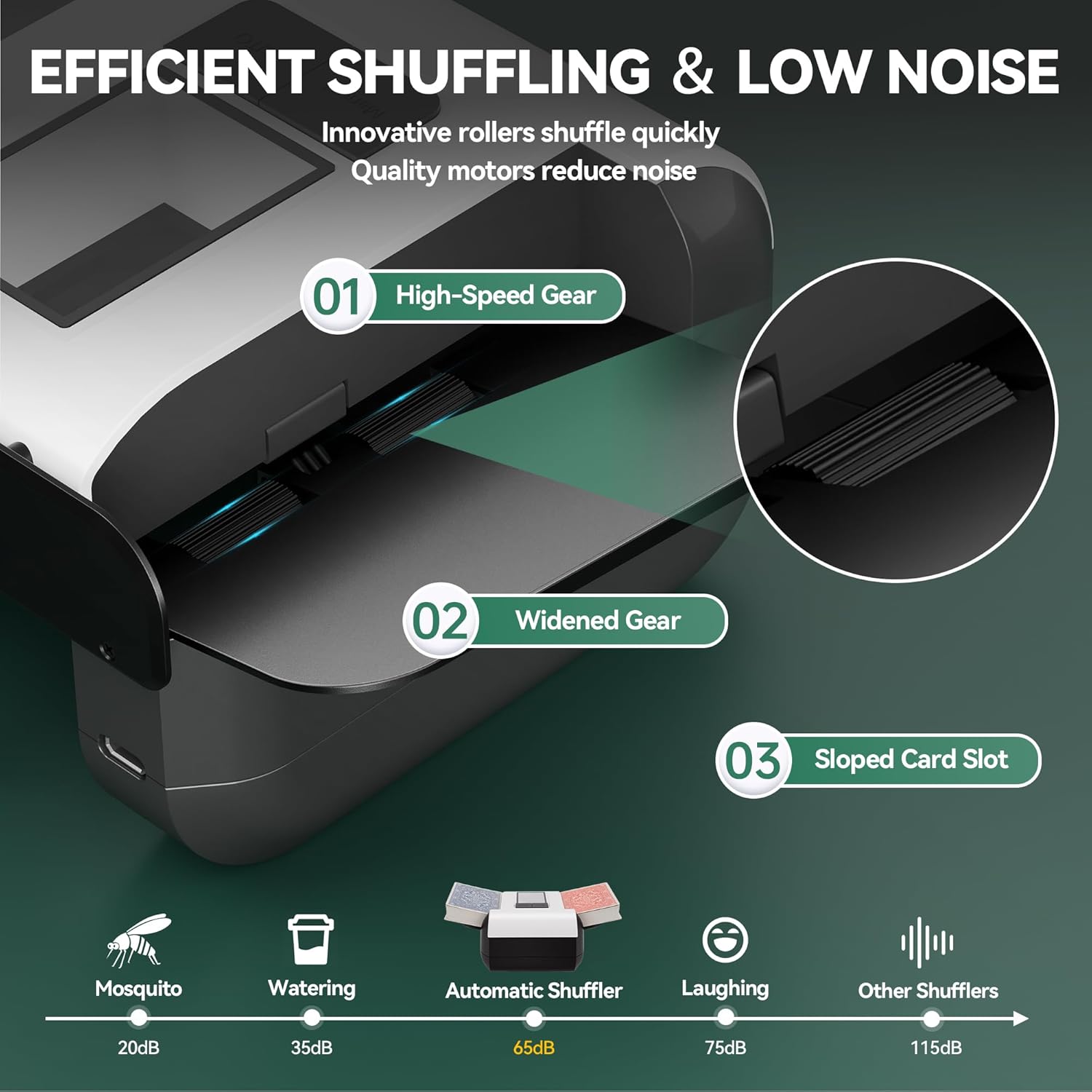 - [Low Noise Technology] - The casino card shuffler operates at only 65 decibels, which is quieter than other shufflers. This allows you to continue communicating clearly while shuffling, without interrupting game strategy discussions, creating a more comfortable and enjoyable social gaming atmosphere.