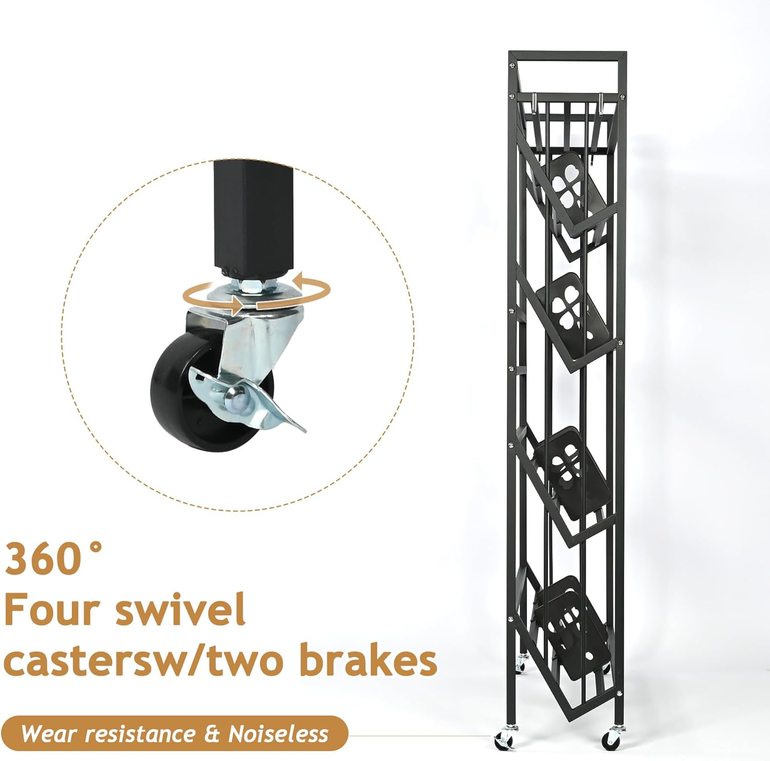 - 360° Rotation Mobile Wheels: This metal rolling book cart comes with 360°rotation wheels. Library book cart equipped with casters, 4 wheels all are locable, which will allow you to move your bookshelf easily, keep books handy