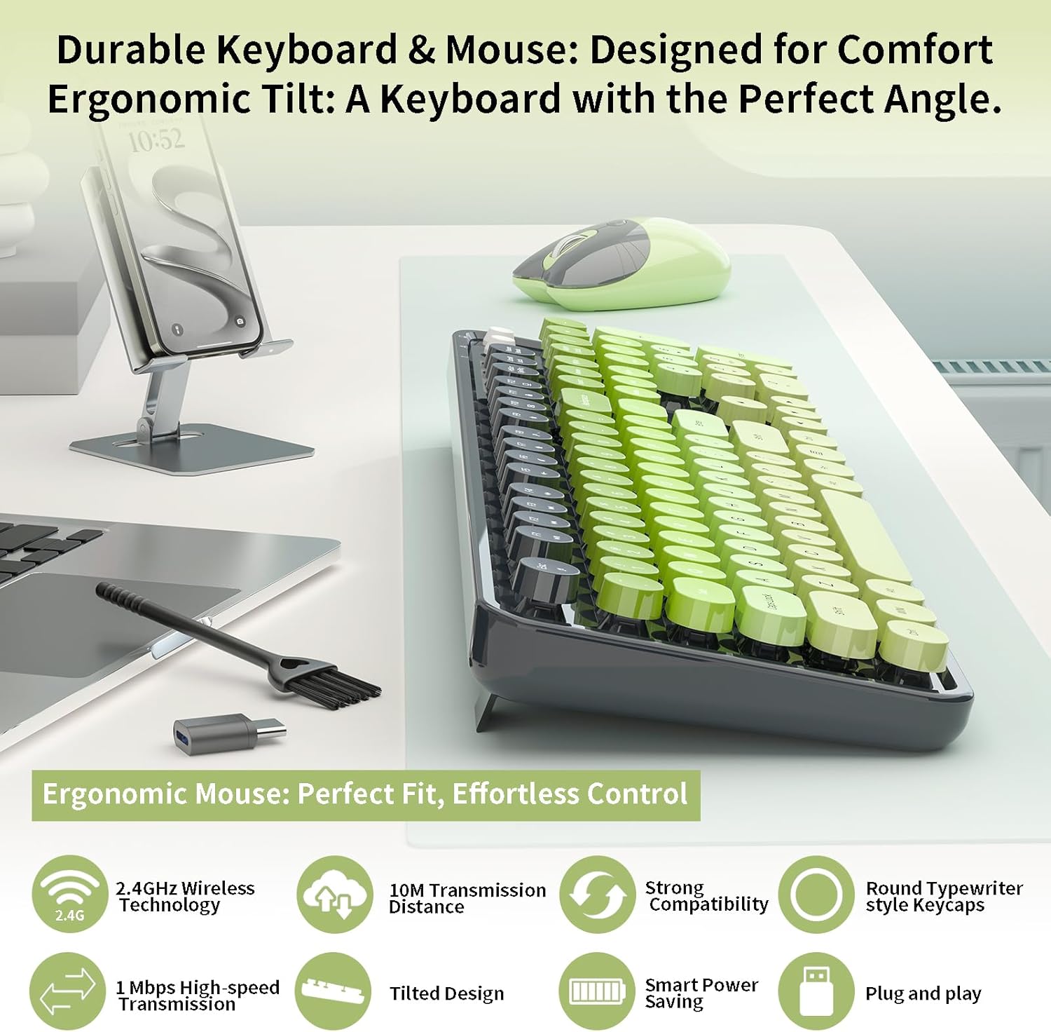 Wireless Keyboard and Mouse, MOFII 104 Round Keycaps Retro Typewriter with OTG & Brush, Full-Size Ergonomic, Ideal for Windows PC, Home, Office and College Gray Green