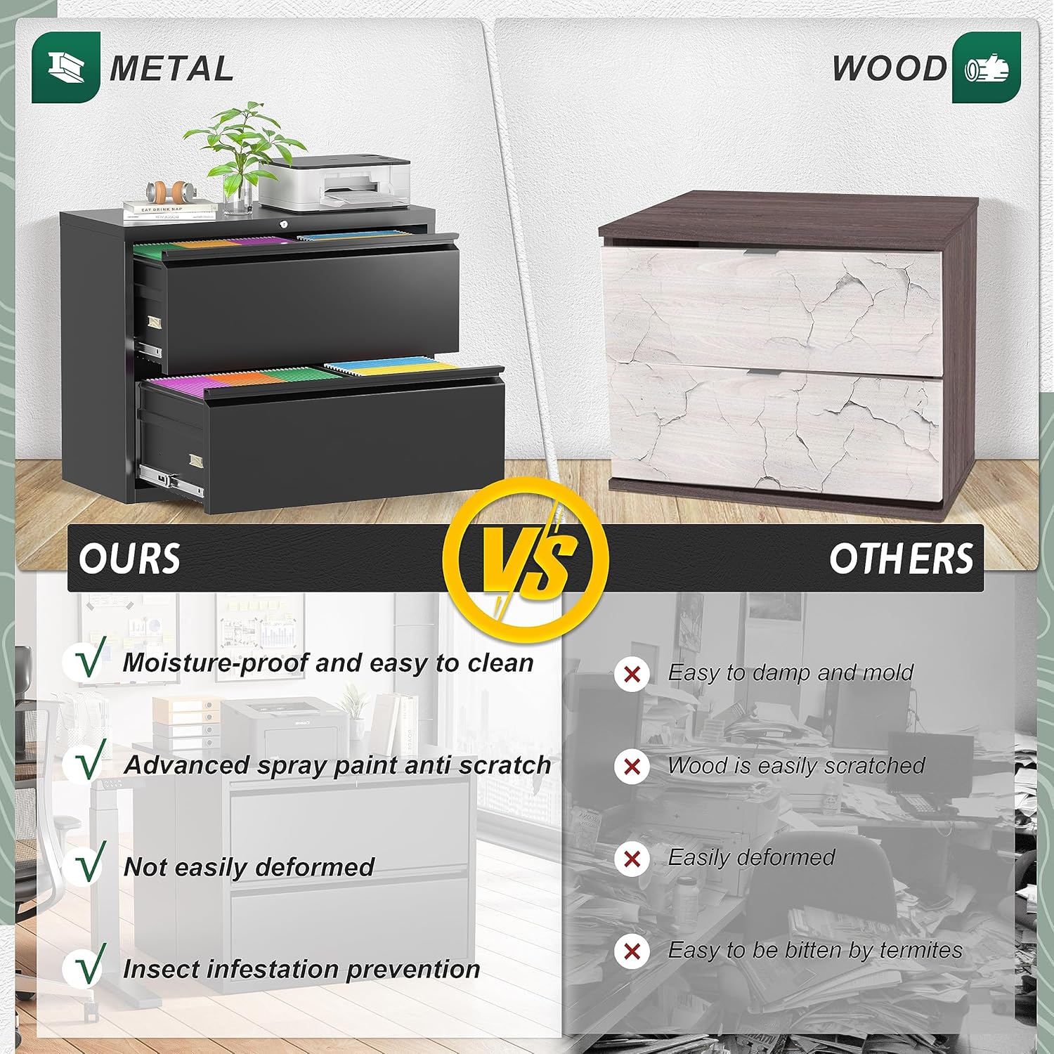 - ✔Large Filing Organization Storage -- This metal lateral filing cabinet with two large file drawers with adjustable hanging bars, accommodate for legal, letter, A4, F4 size hanging folders, great to keep your files, documents and other office supplies organized. Extra plastic pads under the 2 drawer filing cabinet to prevent scratching the floor while maintaining stability.