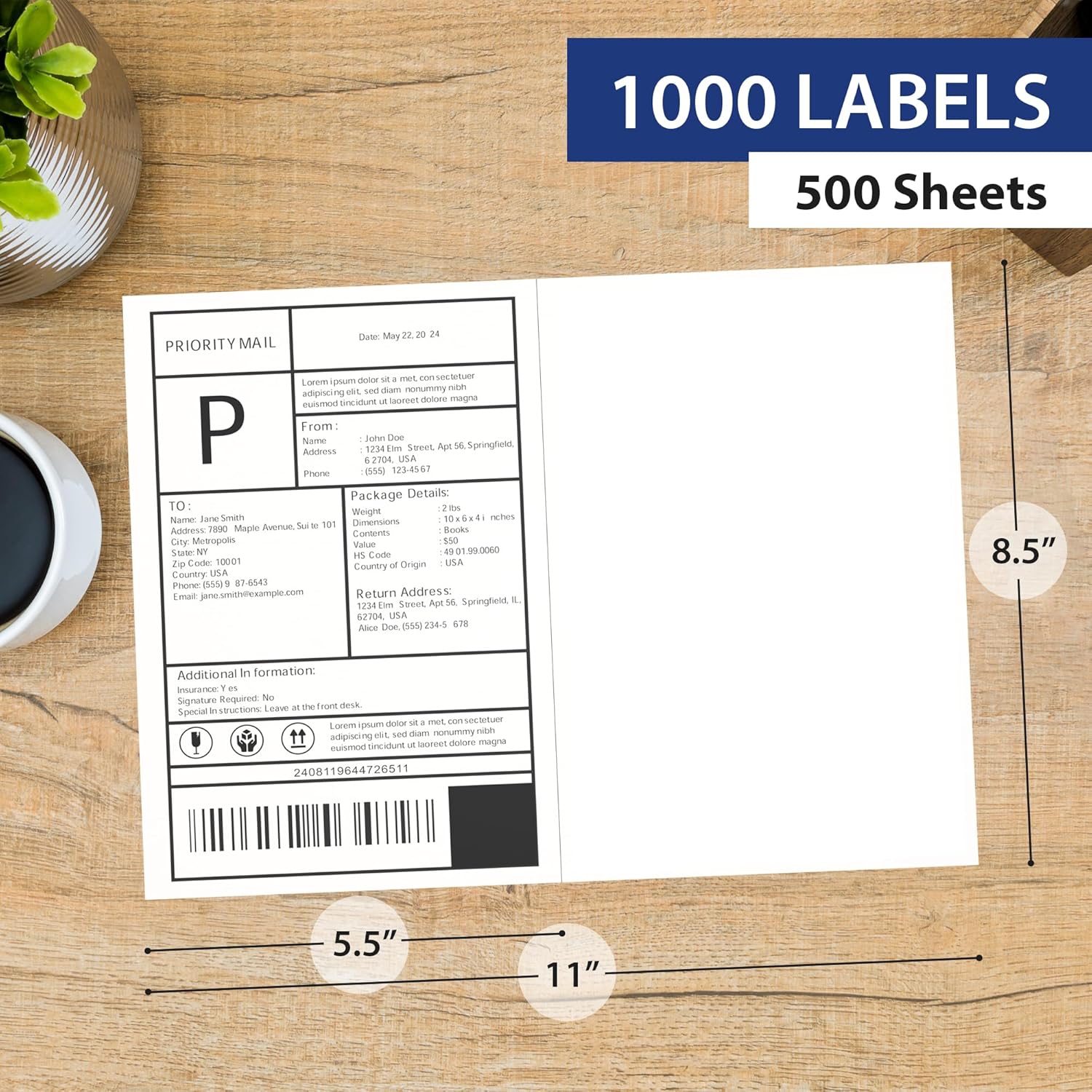 500 Sheet (1000 Labels) | 8.5" x 11" 2 UP Half Sheet Self Adhesive Shipping Labels for Laser & Inkjet Printers | Ecommerce, Address, Mailing, Labeling, Packaging