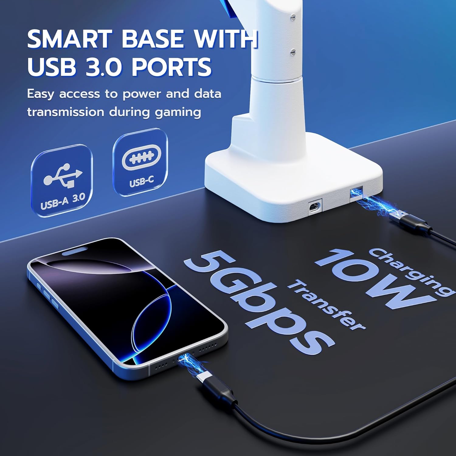 - Smart USB Integration - Designed with a smart base with USB function, this heavy duty monitor arm helps you connect your devices easily and effortlessly. The built-in USB-A 3.0 and USB-C ports expand on the ports easily available to you on your desk, providing convenient options for charging and data transmission. The two integrated USB ports allows simultaneous charging for your two devices at any time.