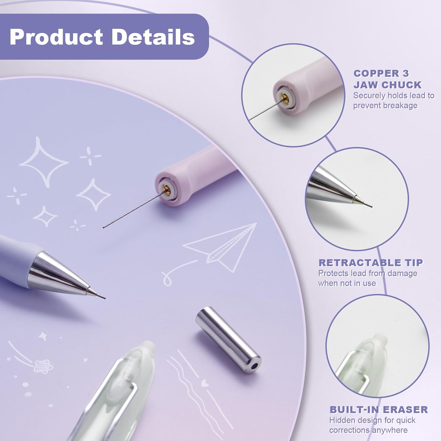 - 🎨 【6 Macaron Colors – Fun Meets Function】 A set of 6 pastel-colored mechanical pencils with a sleek, minimalist design that adds personality to your school, office, or art supplies.