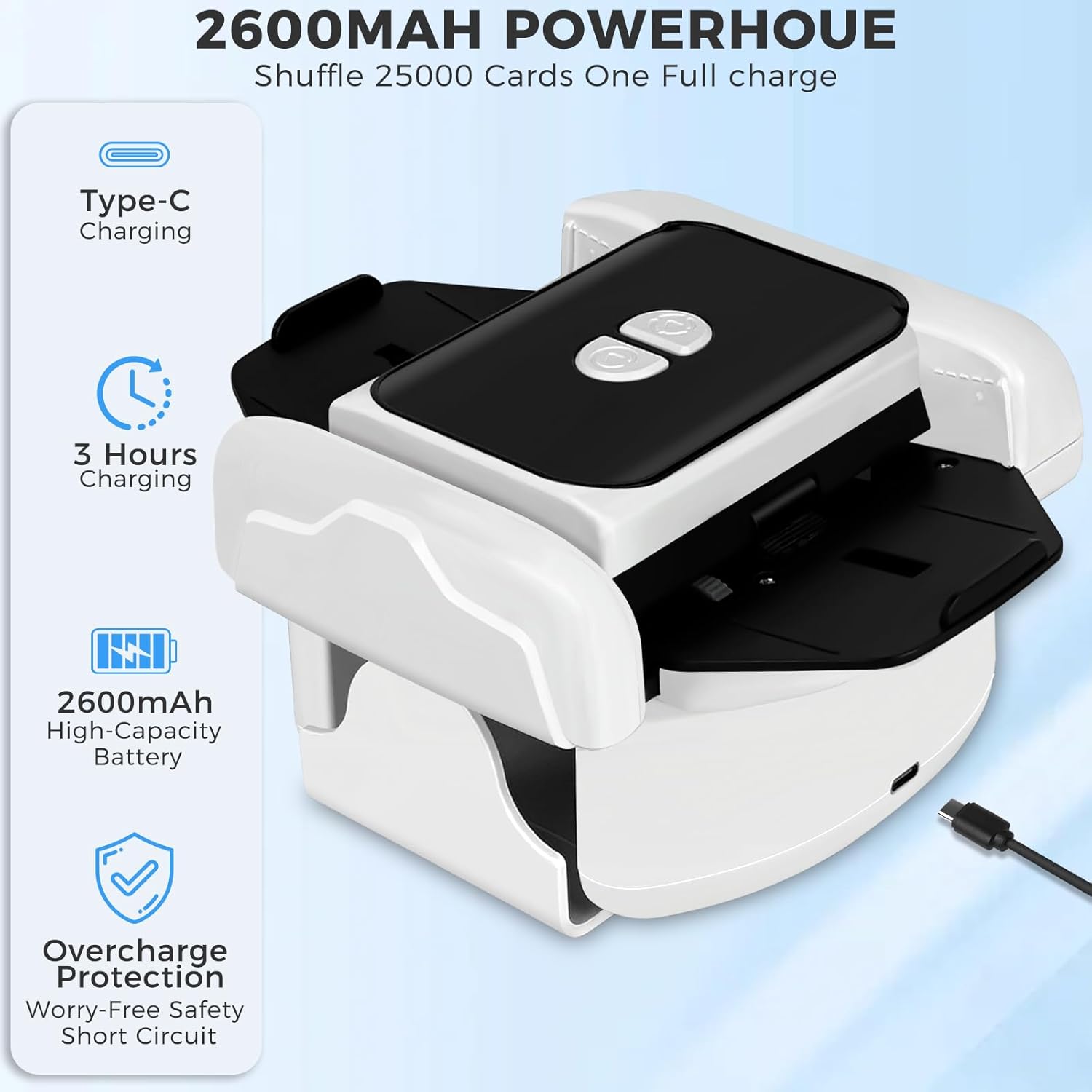 - JAM-FREE SHUFFLING:The electric card shuffler features a high-torque motor and soft rubber rollers, delivering powerful yet smooth card handling. Cards glide effortlessly through the track with zero jamming