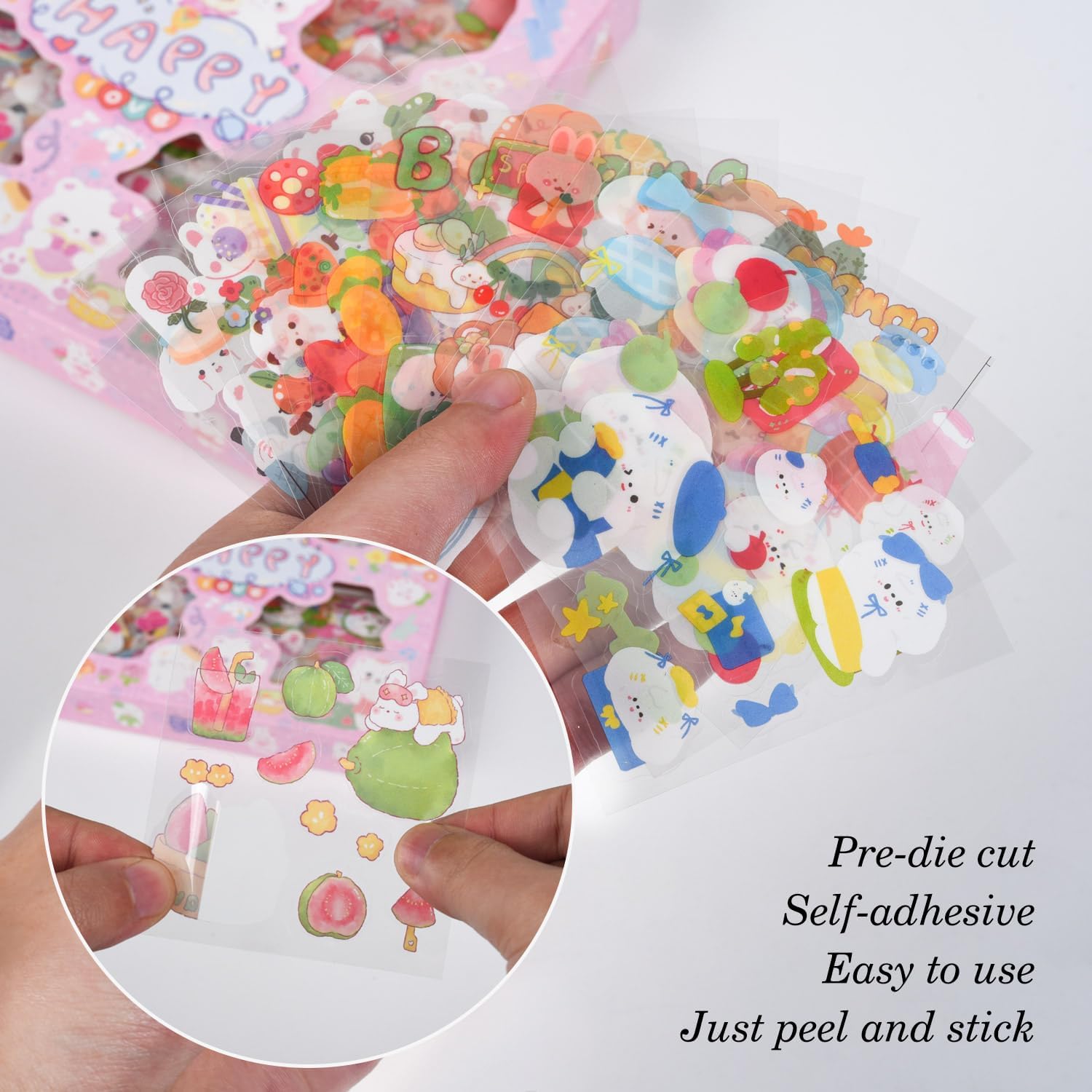 - TO USE - Cute self-adhesive PET cartoon character stickers are well made and cut correctly. They have good tack and abrasion resistance. which is very easy to peel and stick. Just flick the corner with your thumb to separate the backing and sticker. Whether it is for your own use or as a gift for friends and kids, it is a good choice