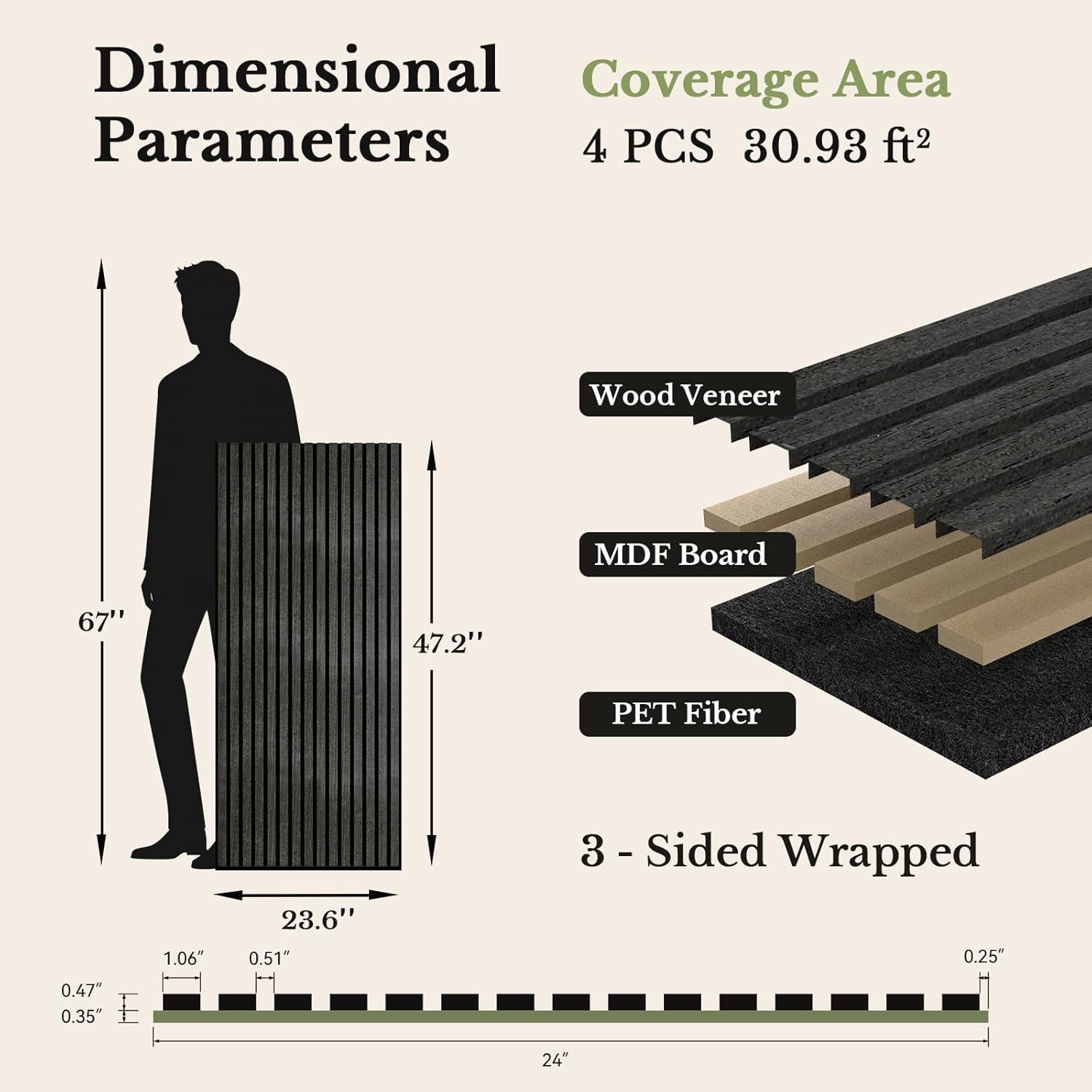 MISSDAY Wood Slat Acoustic Wall Panels, 4 Packs 47.2" x 23.6" Natual Black Soundproof Panel For Interior Wall Decor Noise Absorbing-3D Textured Wooden Panel Sound-Absorbing for Home, Office, Studio